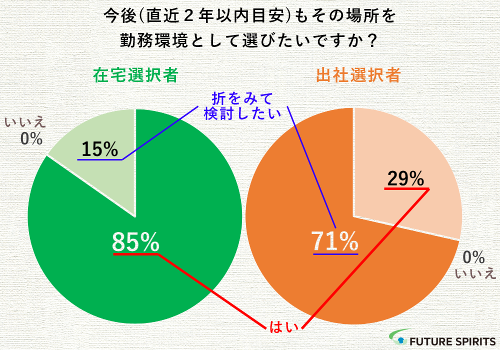 - 在宅選択者の約85%が今後も在宅勤務を選択したいと回答した一方で、出社選択者は約71%が出社での勤務方式を今後は再検討したいと回答