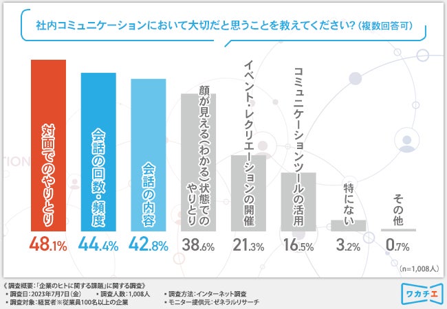 「社内コミュニケーションにおいて大切だと思うことを教えてください(複数回答可)」と質問したところ、『対面でのやりとり(48.1%)』と回答した方が最も多く、次いで『会話の回数・頻度(44.4%)』『会話の内容(42.8%)』『顔が見える(わかる)状態でのやりとり(38.6%)』『イベント・レクリエーションの開催(21.3%)』『コミュニケーションツールの活用(16.5%)』と続きました。