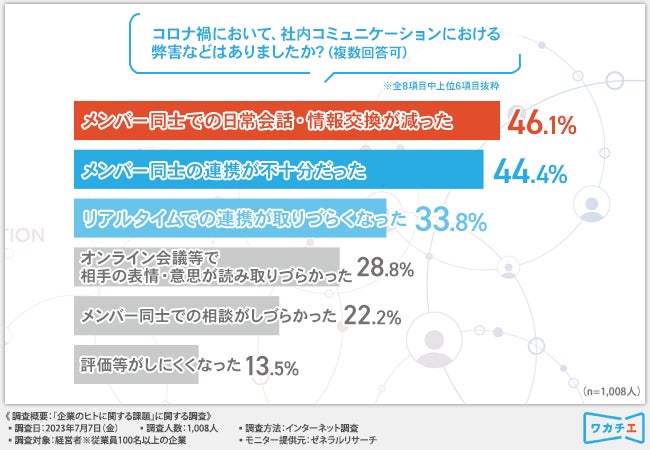 「コロナ禍において、社内コミュニケーションにおける弊害などはありましたか(複数回答可)」と質問したところ、『メンバー同士での日常会話・情報交換が減った(46.1%)』と回答した方が最も多く、次いで『メンバー同士の連携が不十分だった(44.4%)』『リアルタイムでの連携が取りづらくなった(33.8%)』『オンライン会議等で相手の表情・意思が読み取りづらかった(28.8%)』『メンバー同士での相談がしづらかった(22.2%)』『評価等がしにくくなった(13.5%)』と続きました。