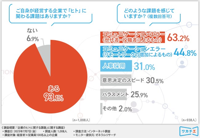 そこで今回、ハイブリッドワークをサポートするWEBアプリ『ワカチエ』(https://c.wakachie.com/linkrrp04)を提供する株式会社ソノリテは、経営者を対象に、「企業のヒトに関する課題」に関して調査を実施しました。