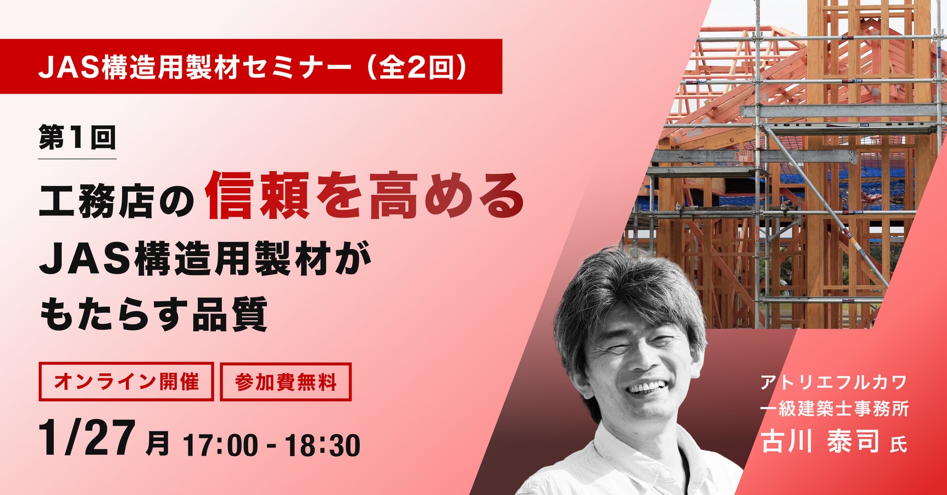 本セミナーでは、設計士や工務店に差し迫る4号特例改正への対応と、JAS構造用製材を「使う立場」と「作る立場」の双方の視点から、その価値と可能性を解説します。