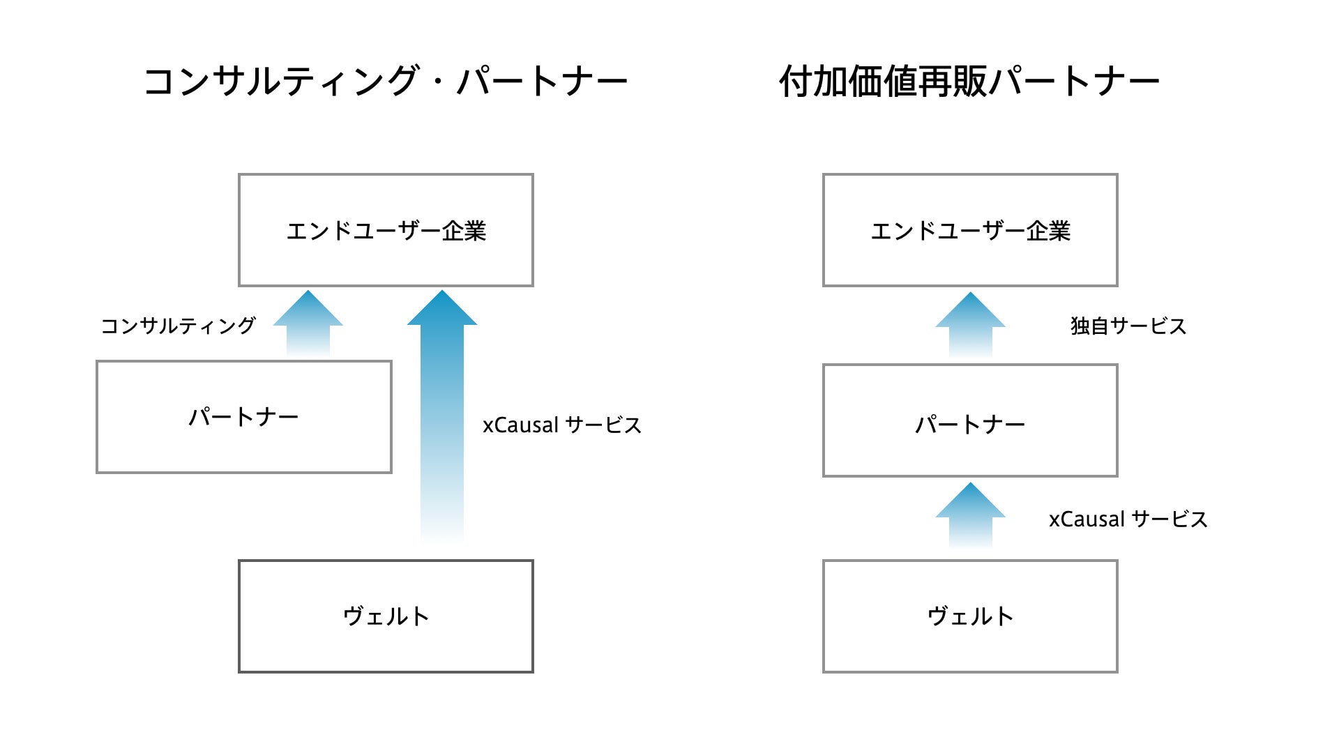 ヴェルトは、「xCausal™」のパートナー・プログラムとして 2 種類のモデルを展開し、各産業や領域に専門知 識を持つパートナー企業と連携してまいります。 1. コンサルティング・パートナー:パートナー企業が「xCausal™」のコンサルティングを提供し、ヴェルト が顧客に「xCausal™」を直接提供。コンサルティング・パートナーは、自社顧客の「xCausal™」環境にア クセスし、解析やコンサルティングを提供することが可能です。 2. 付加価値再販パートナー:パートナー企業が「xCausal™」を自社サービスに組み込み、独自の付加価値をつ けて提供。パートナーの提供するアプリケーションやサービスに、「xCausal™」をオプション機能として組 み込む、他の AI モデルと連携させる等、パートナー企業の既存サービスに新たな価値を付加することが可能 です。
