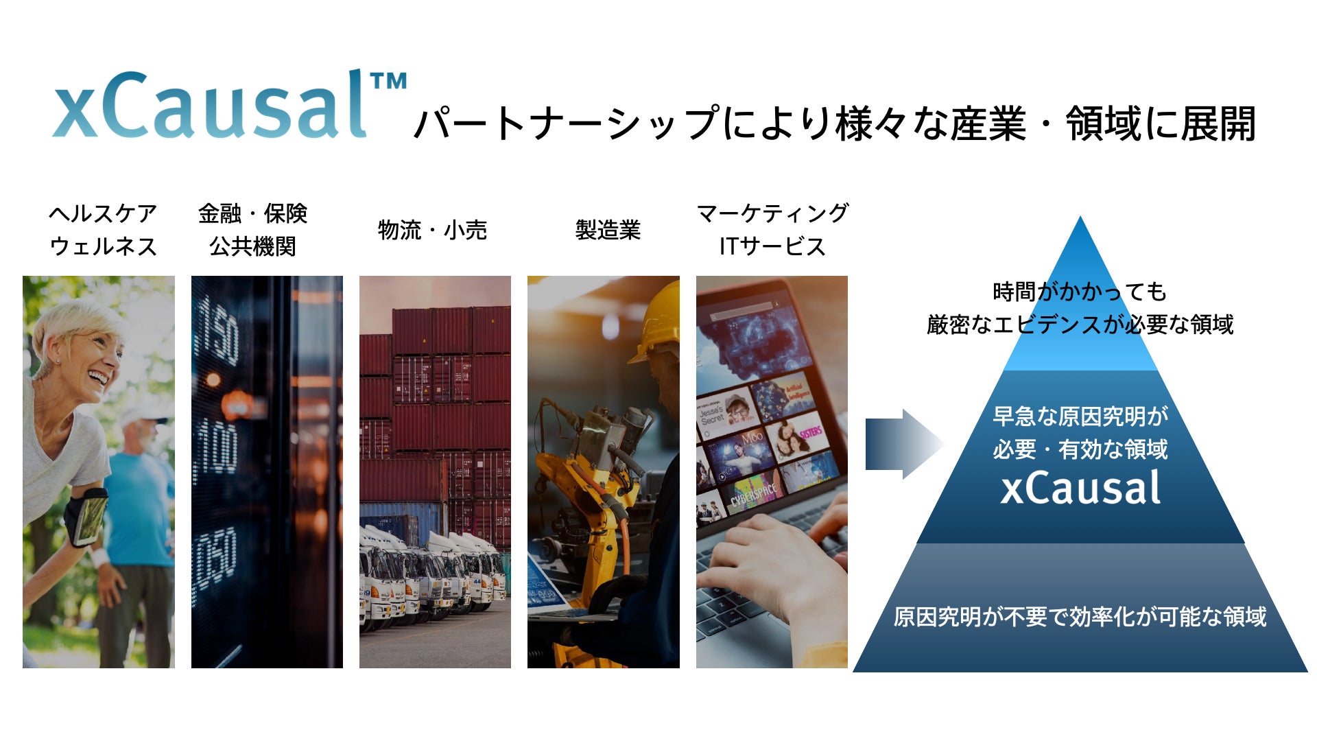 現在、多くの企業や組織では、課題に対する原因究明に、相関関係に基づいた仮説立てと検証を行なっていま すが、擬似的な相関によるやり直しなどにより多大な時間を要しています。「xCausal™」は、自社開発の独自 技術と最新の因果探索・因果推論技術を組み合わせることで、仮想的な因果関係のトライアンドエラーを分単 位で高速に実施することを可能にしました。これにより、研究開発サイクルの短縮や成功率の向上、高度人材 の生産的活用が期待できます。