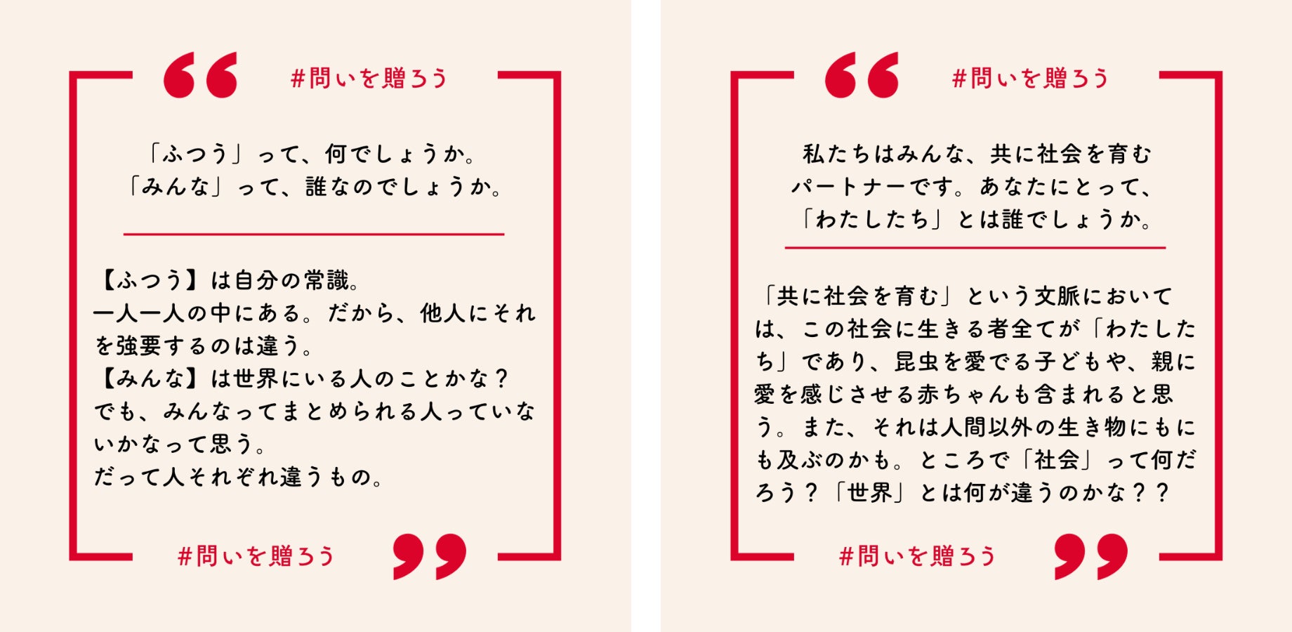 異なる私たち一人ひとりが大切にされている、そんな社会は誰かがつくる確固たる正解ではなく、ふと感じる違和感や、私たちが受け取る願いや問いから、始まっていく。そんな思いから、2021年からキャンペーンを開始し、今年は3回目の開催となりました。