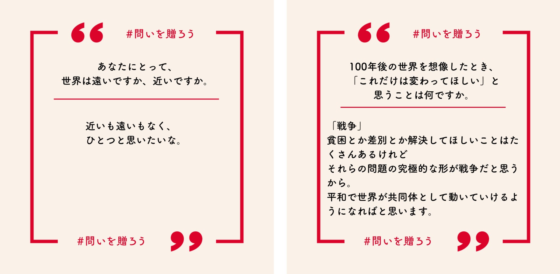 「自分をみつめる」「まわりを見つめる」「未来をみつめる」といった3つのテーマに紐づいた「問い」を贈ることで、自分の願いに気づき、他者への想像力をはたらかせ、願う未来と向き合うきっかけをつくります。