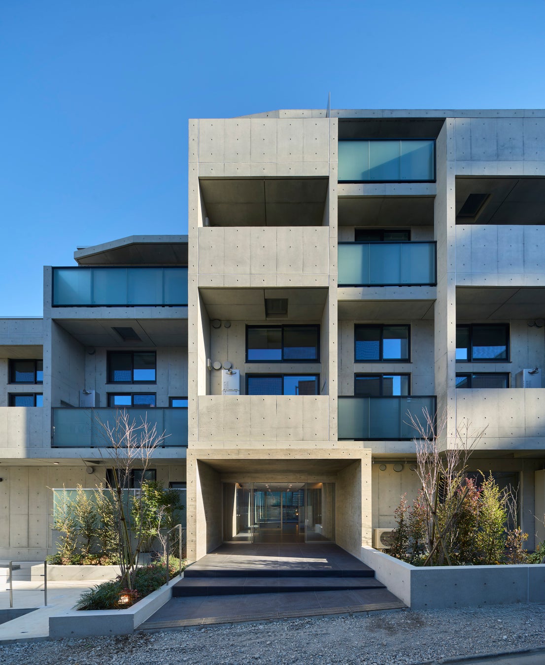 壁式構造を採用し、全39戸に対し30タイプという極めて多様な住戸プランを実現している。均質になりがちなワンルームマンションにおいて、各住戸に固有の価値を与えるとともに、その複雑な構成が外観に豊かな表情をもたらしている。隣接する寺社の豊かな緑を取り込み、建物を切り通しのように分断し、エントランスから寺社の緑へと続く大きな吹抜けを設け、広い踊り場を持つ階段からも緑を眺められるなど、居住者の感性に訴える豊かな空間を創出した。