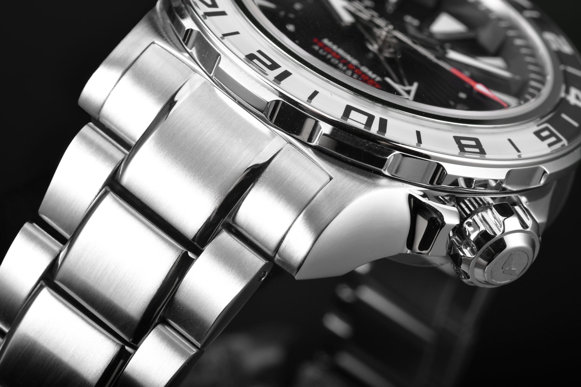 ベゼルはGMTウォッチならではの、ツートンカラーで両方向回転式、1周24ピッチで、同時に3つの異なるタイムゾーンが表示できる本格仕様。