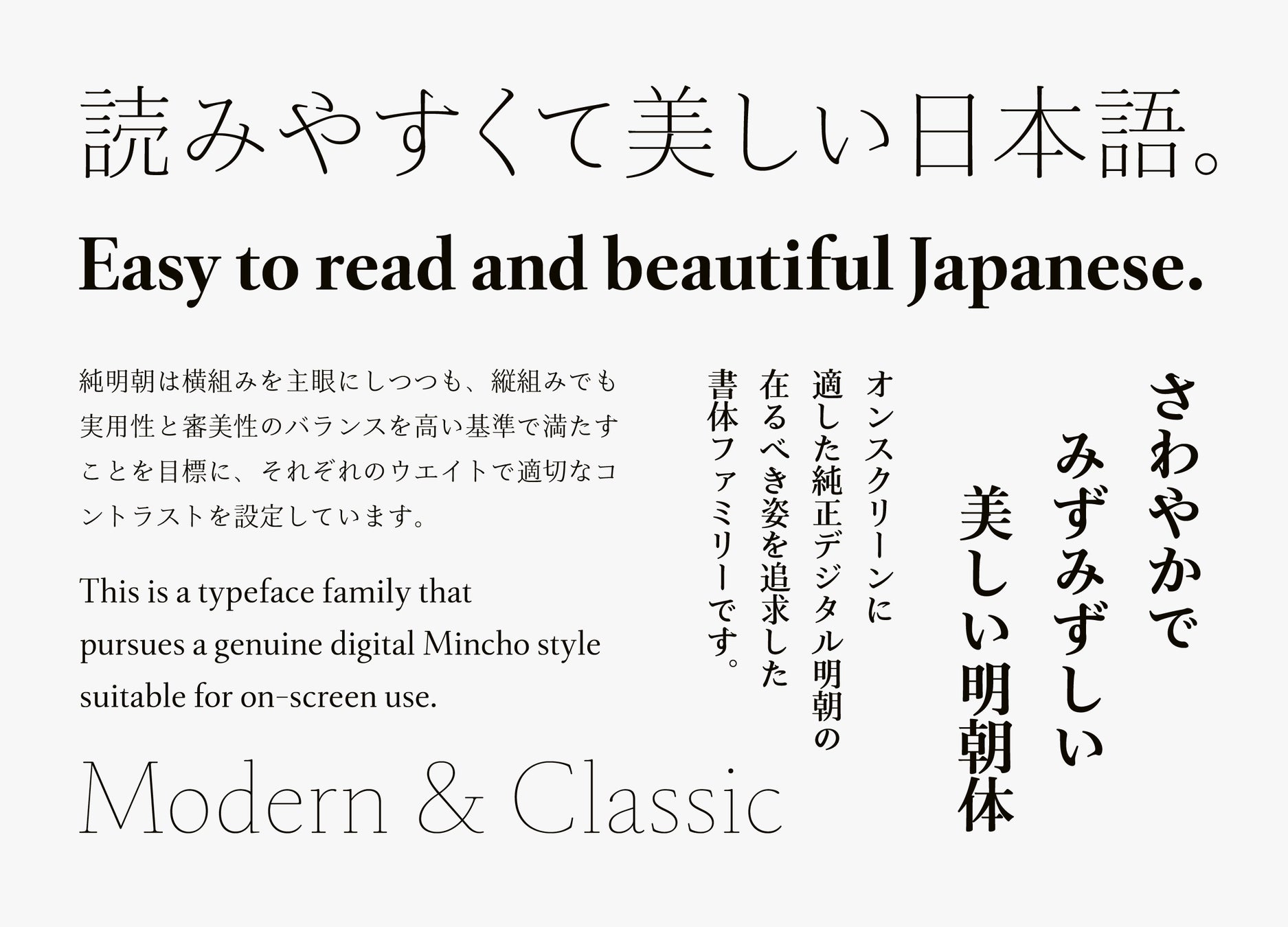 純明朝は「横組みの日本語をもっと読みやすく、もっと美しく」をテーマにした書体ファミリーで、安定した読み心地が得られるよう、それぞれのウエイトにおいて適切なコントラスト(縦画と横画の太さの比率)を設定しました。オンスクリーンで敬遠されがちな明朝体の弱点を克服するとともに、画面にうるおいを与えるべく明朝体の美しさを十分に引き出す書体設計をおこなっています。