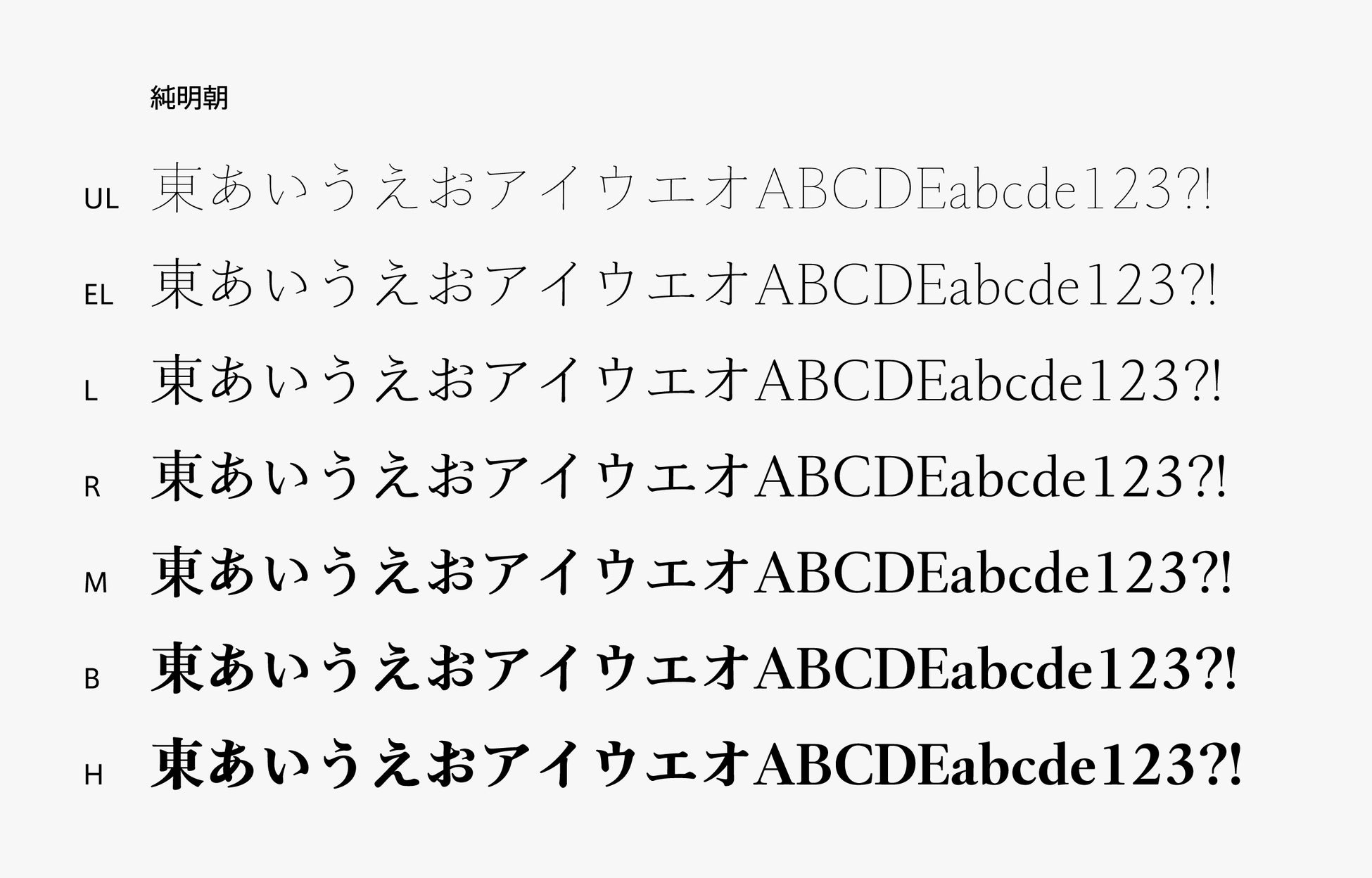 純明朝ファミリーは、UL(ウルトラライト)、EL(エクストラライト)、L(ライト)、R(レギュラー)、M(ミディアム)、B(ボールド)、H(ヘヴィ)の7ウエイトで構成しています。ULとELは、キャッチフレーズやヘッドラインなどの用途で極細ウエイトならではの繊細な美しさを発揮します。Lは本文に最適なコントラストを設定したウエイトで、純明朝の中核をなすフォントです。Rは紙面・画面を問わずキャプションなどの小さなサイズで安心して使用できます。BとHは見出し用途で新鮮な印象を与えたいとき重宝するフォントです。