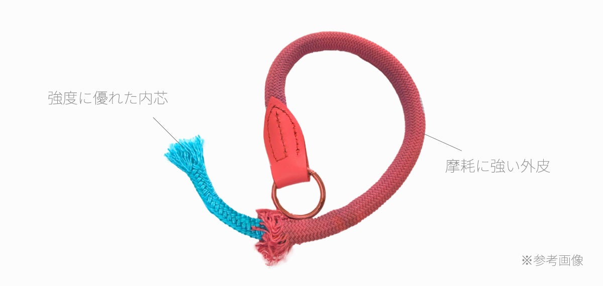 登山用のロープ(クライミングロープ)と同じ素材・構造をしており、摩耗や引張に強い、頑丈で高耐久なアイテムです。