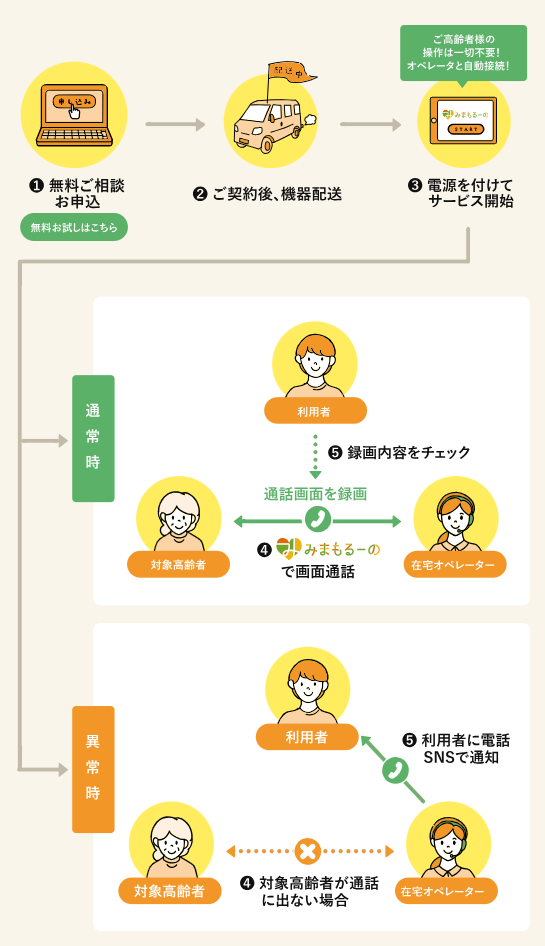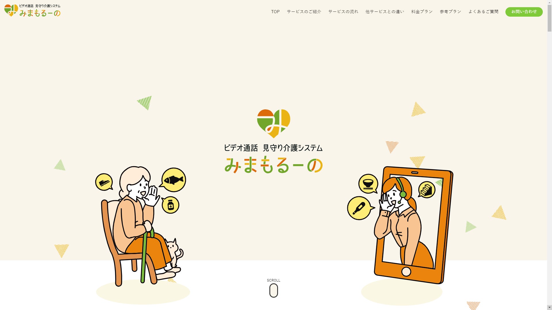 みまもるーのは独居老人の高齢者の親と離れて暮らしており、会うことや連絡をすることが難しい子息様に代わり、オペレーターが定期的なビデオ通話により生活や体調に変化がないか高齢者様の見守りを行います。子息様の高齢者介護に対する不安を解決します。