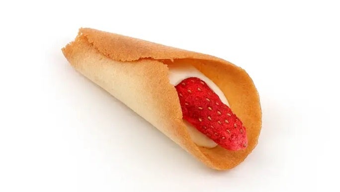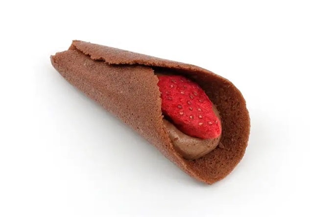 さっくりと焼き上げたココア生地のラングドシャにミルクチョコクリームを絞り、フリー ズドライの苺をのせました。