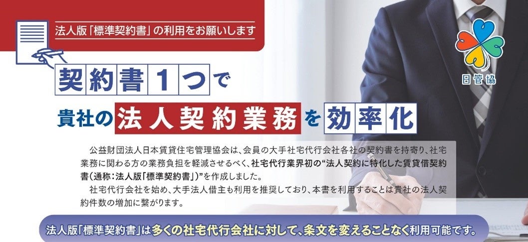 公益財団法人日本賃貸住宅管理協会(本部:千代田区、会長:塩見紀昭、以下:日管協)は、現在『法人版「標準契約書」』の利用を普及していますのでお知らせいたします。