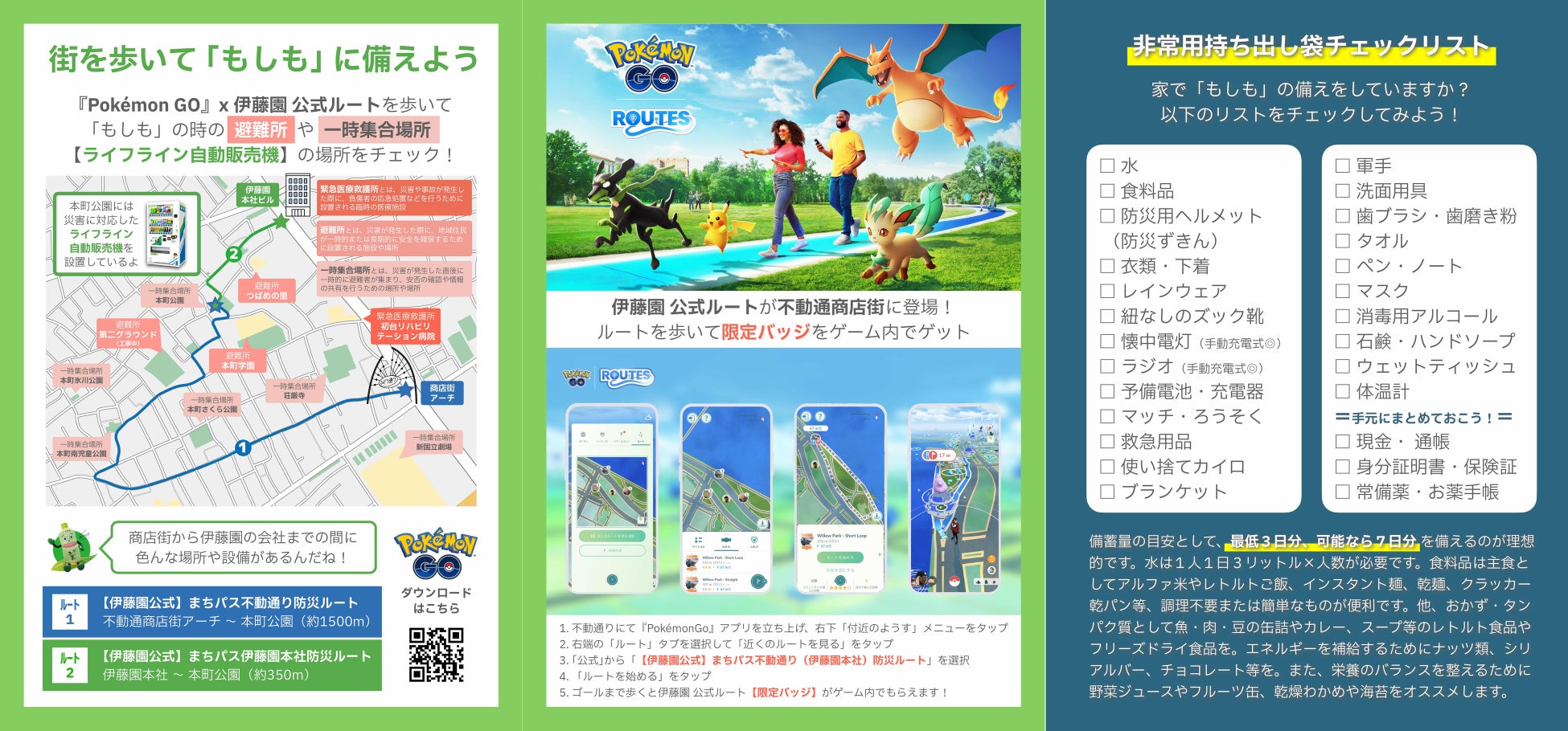 同日開催する商店街主催イベント「くるくる商店街」にて配布開始。人気アプリ「Pokémon GO」のルート機能を活用した、近隣の避難所や設備を知ることができる、伊藤園公式の防災ルートも商店街に登場!