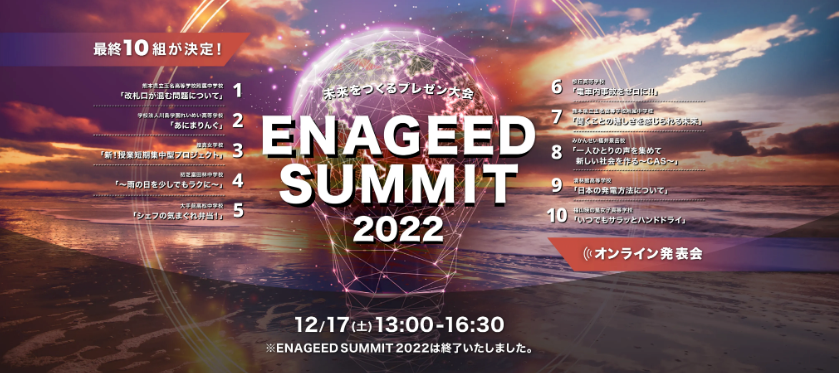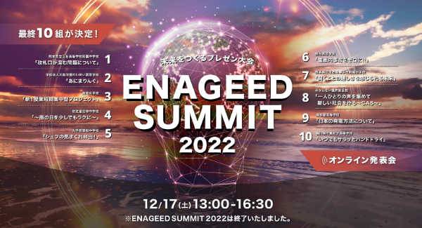 毎年12月に実施している全国のENAGEED導入校の生徒によるプレゼン大会「ENAGEED SUMMIT」でも、エントリー総数4,394人の中から弊社社員による計3回の審査を通過した10組のグループが、身近なところから見つけたテーマについて課題解決に向けたアイデアを考え、プレゼンを行いました。