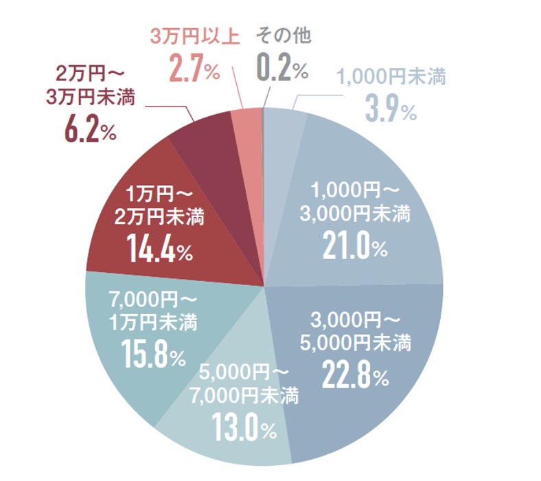 全体で多かった回答が「1,000円~3,000円未満」が21.0%、「3,000円~5,000円未満」が22.8%、「7,000円~1万円未満」が15.8%となりました。また子どもに対し月に1万円以上使用しているのは23.3%となりました。こちらの回答を「Q.子どもにとっていいことや物に、お金を惜しまない」の回答ごとにみてみると、「とても当てはまる」と回答した人が1万円以上使用している割合が36.5%と10%ほど多くなる結果となりました。
