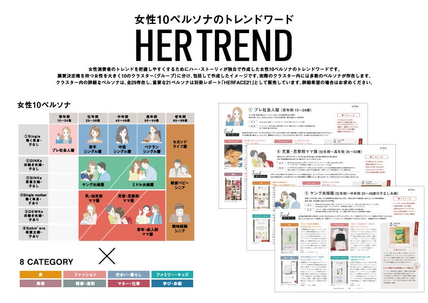HERSTORY REVIEWでは10ペルソナ別のトレンドを毎月研究発表しており、各企業様のマーケティングで実用的に活用ができるととても好評をいただいています。