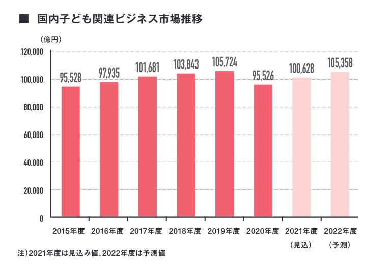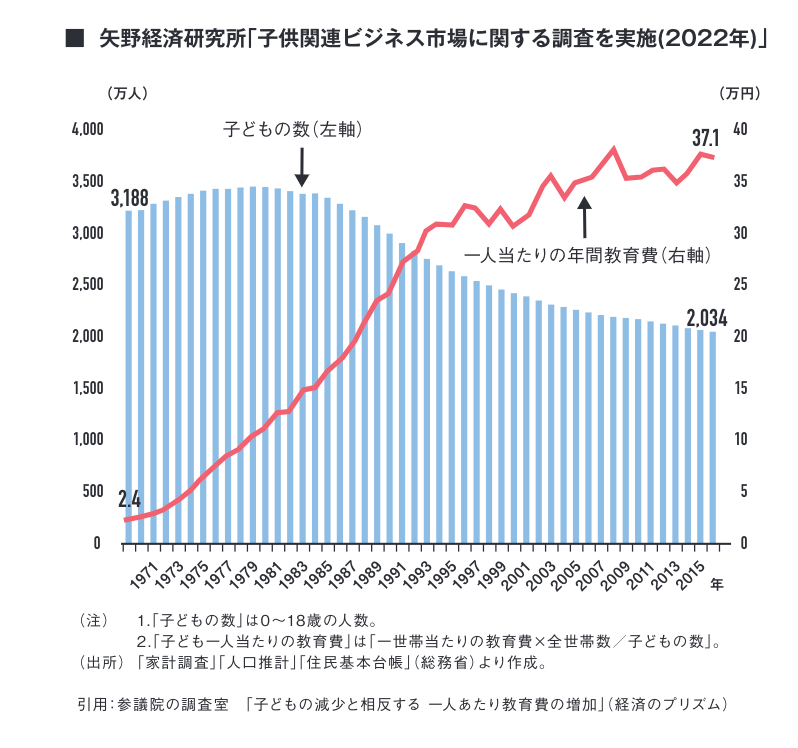 厚生労働省の発表によると2022年の国内の出生数(速報値)は前年比 5.1%減の79万9728人と、過去最低を記録しています。急速な少子化の一方で、国内子ども関連ビジネス市場は堅実に成長を続けており、2020年度はコロナ禍でいったん減少したものの2022年度にはコロナ前の市場規模にまで回復する見込みです。また、参議院の調査室によると、子どもの数が減少しているのに反して子ども一人当たりの年間教育費は年々上昇、年間教育費はこの30年で10万円以上も増加していることがわかります。キッズ市場は6ポケット市場(子ども1人に対して、両親と祖父母の合計6人の財布が潜在している)ともいわれ、少子化においても成長が期待できる市場といえるでしょう。