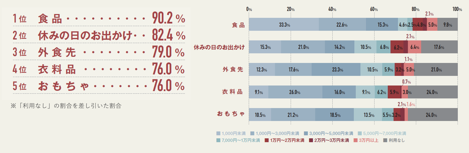 子どもの希望で購入・利用につながった割合が多いものとしては、「食品(90.2%)」「休みの日のお出かけ(82.4%)」「外食先(79.0%)」「衣料品(76.0%)」「おもちゃ(76.0%)」「本・絵本(70.1%)」「学校で使用する文房具(60.5%)」が挙げられました。上記の中で「休みの日のお出かけ」「食品」「外食先」「衣料品」は購入の主導権は主に母親が握っているものの、子どもの希望が反映されやすい物・サービスとなり、マーケティングに際しては、子どもへのPRが欠かせないといえます。特に、お出かけ、外食、おもちゃ、衣料品は5,000円以上使っている割合が2割以上と一定数見受けられるため、見逃せない市場です。