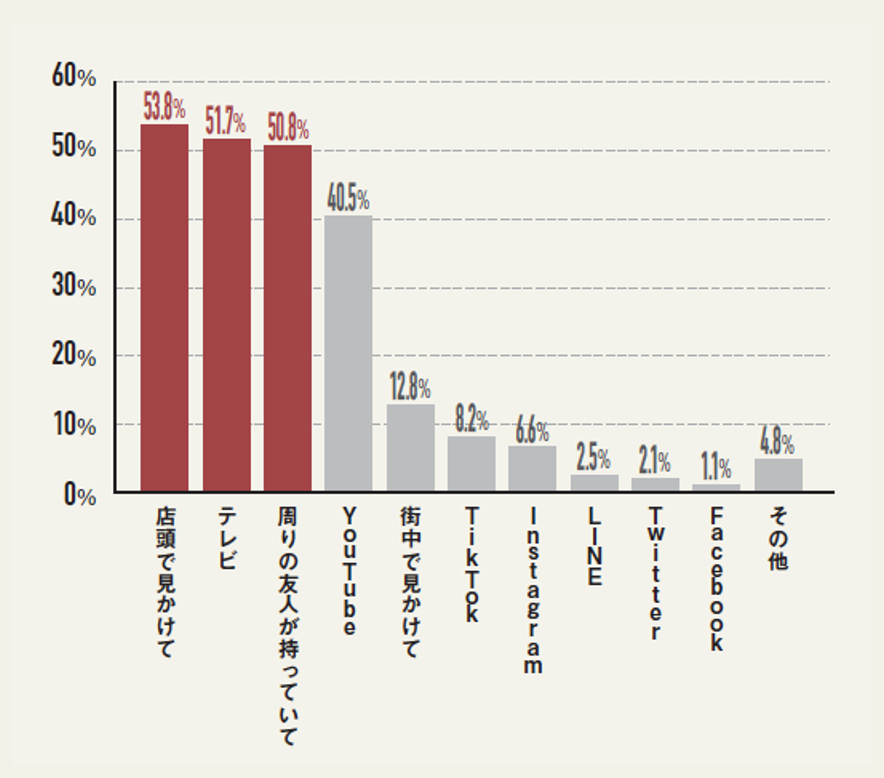 「店頭で見かけて」が53.8%、「テレビ」が51.7%、「周りの友人が持っていて」が50.8%、となりました。POPは子どもにも伝わるように写真やイラストで分かりやすくしたり、店頭で映像等を使用し訴求するのも効果的だといえます。その他、YouTubeがきっかけとなっている割合も40.5%いるため、YouTubeを利用した訴求も欠かせません。