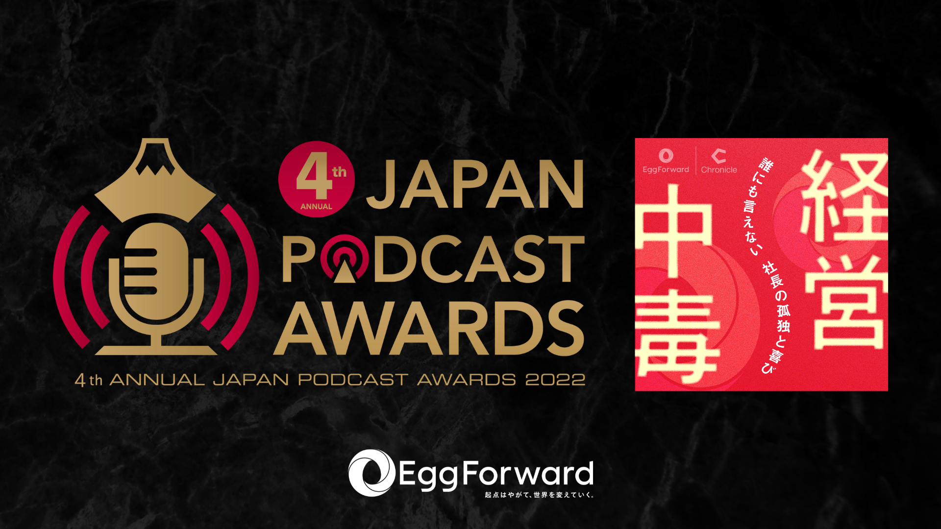 経営組織コンサルティング/VC事業及びHRプラットフォーム事業を手がけるエッグフォワード株式会社(本社:東京都港区)の代表徳谷が出演するPodcast『経営中毒 〜だれにも言えない社長の孤独〜』が、日本を代表するPODCASTを表彰した第4回JAPAN PODCAST AWARDSのベストナレッジ賞を受賞したことをお知らせいたします。