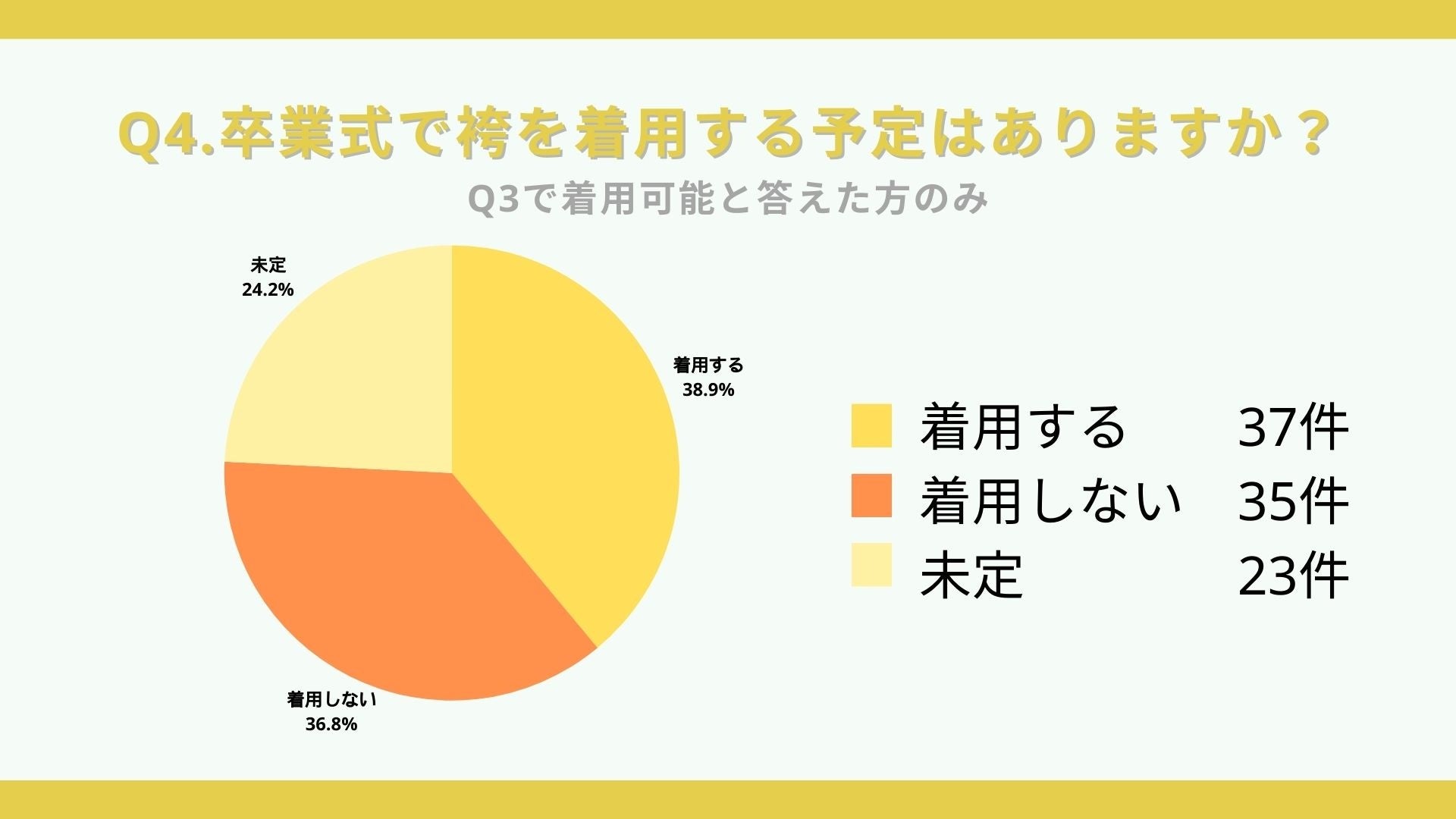 実際に卒業式で袴を着用する予定があるか質問したところ、Q3で着用可能と回答した方のうち、38.9%の方が「着用する」と回答しました。