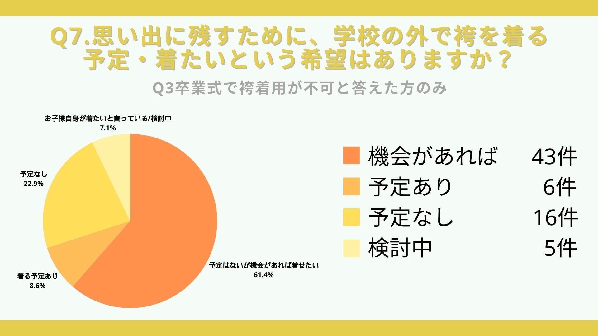小学校の卒業式で袴の着用が不可の場合でも、予定はないが機会があれば着せたいと答えた方は61.4%、着る予定があると回答した方は8.6%いることがわかりました。