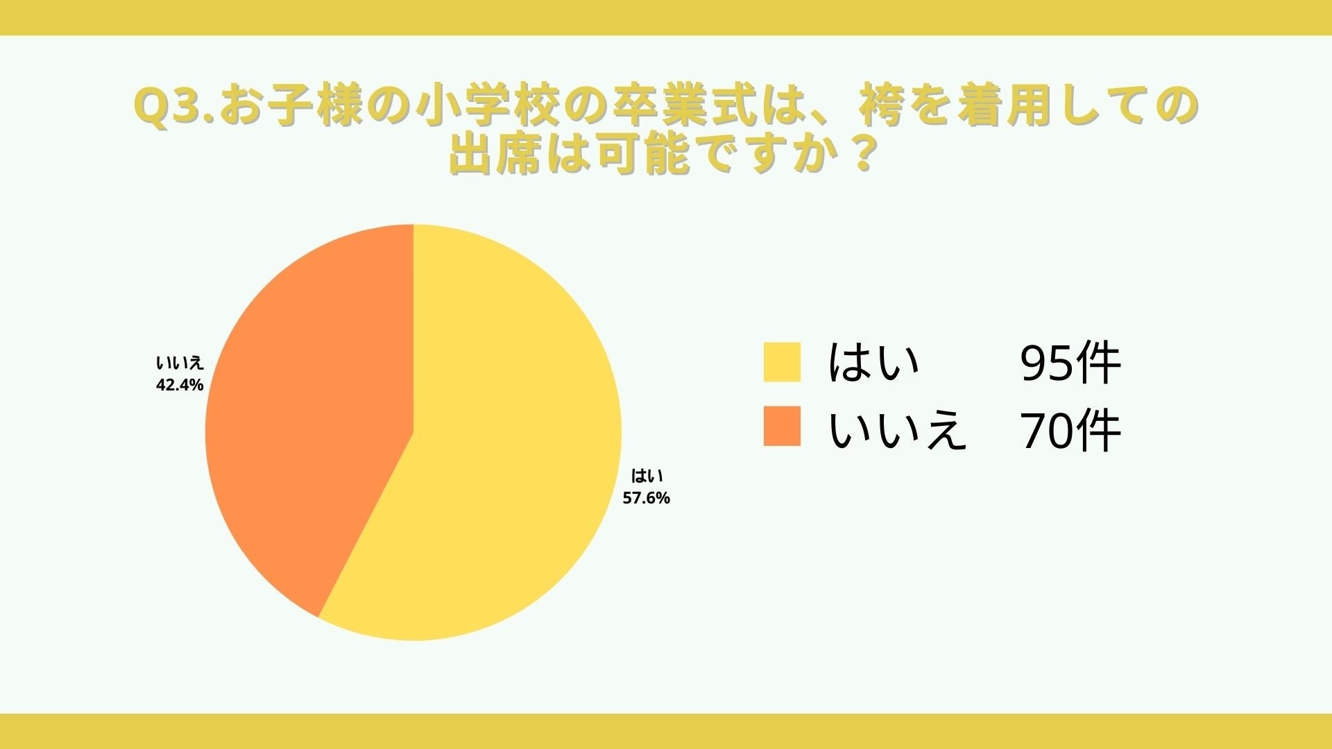 お子様の卒業式に袴着用が可能か聞いたところ、57.6%と半数以上の小学校で袴の着用を認めていることが分かりました。