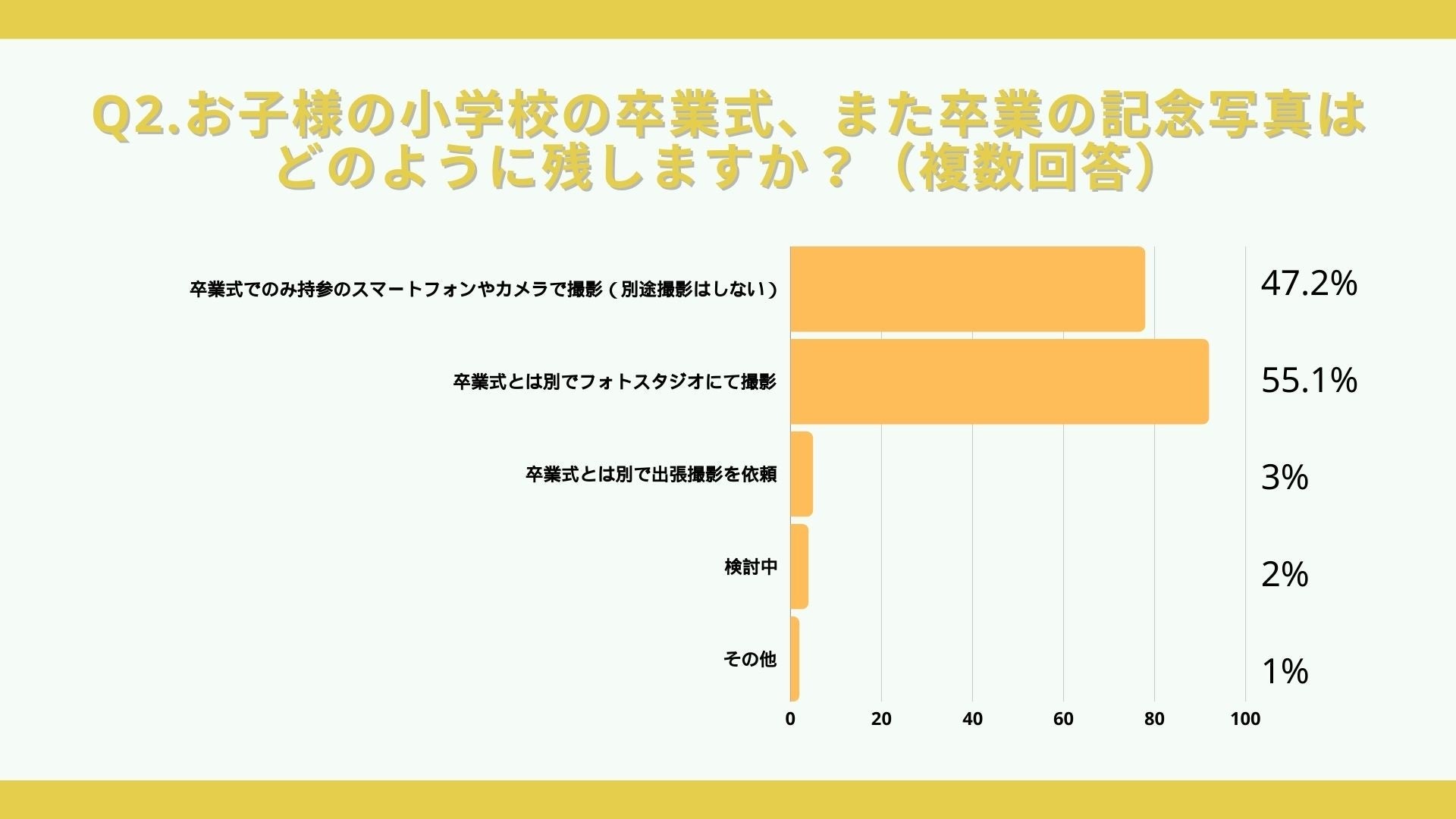 お子様の小学校の卒業式、また卒業の記念写真についてどのように残すか質問したところ、お子様の卒業の記念写真を卒業式とは別で撮影する家庭は55.1%の結果でした。