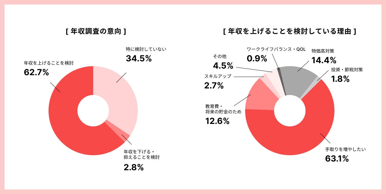今後の年収の調整意向についての問いでは、62.7%が「年収を上げることを検討」と回答。さらに、年収を上げたい理由としては「手取りを増やしたい」が63.1%と最も多く、続いて「物価高対策(14.4%)」、「教育費・将来の貯金のため(12.6%)」など、昨今の物価上昇や将来への不安を背景に、年収アップを検討したい傾向がみられました。