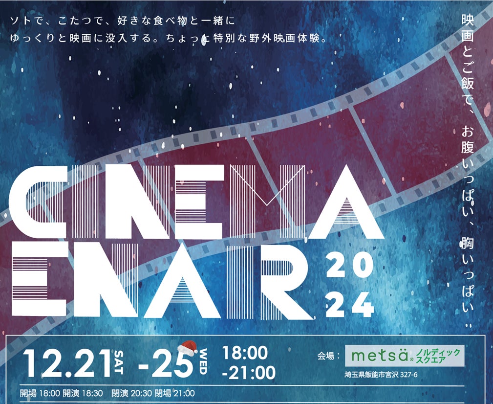 埼玉県飯能市にある北欧文化を楽しめる「メッツァビレッジ」にて2024年12月21日~25日の期間限定クリスマスシネマイベント「CINEMA EN AIR」を開催。