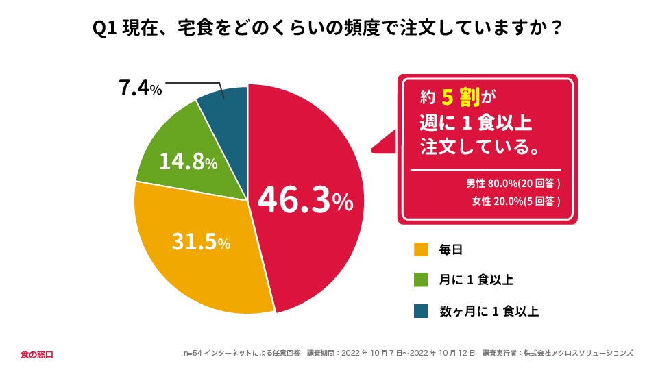 そこで、株式会社アクロスソリューションズと一般社団法人 日本唐揚協会が共同運営している食の窓口(URL:https://karaage.ne.jp/contents/ )は、20歳〜59歳の男54人を対象に「宅食・宅配弁当ついてのアンケート調査」を実施しました。
