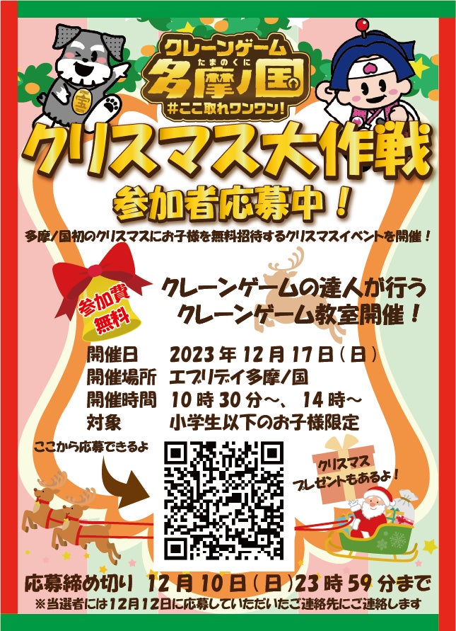 そのエブリデイ多摩ノ国店の累計来場者数が80万人を突破しました。これに感謝を込め、2023年12月17日(日)に、小学生6年生までのお子様を招待し、クレーンゲーム達人がサンタクロース姿で取り方を教えてくれる、無料のクリスマスクレーンゲーム教室イベントをエブリデイ多摩ノ国店で初開催します。