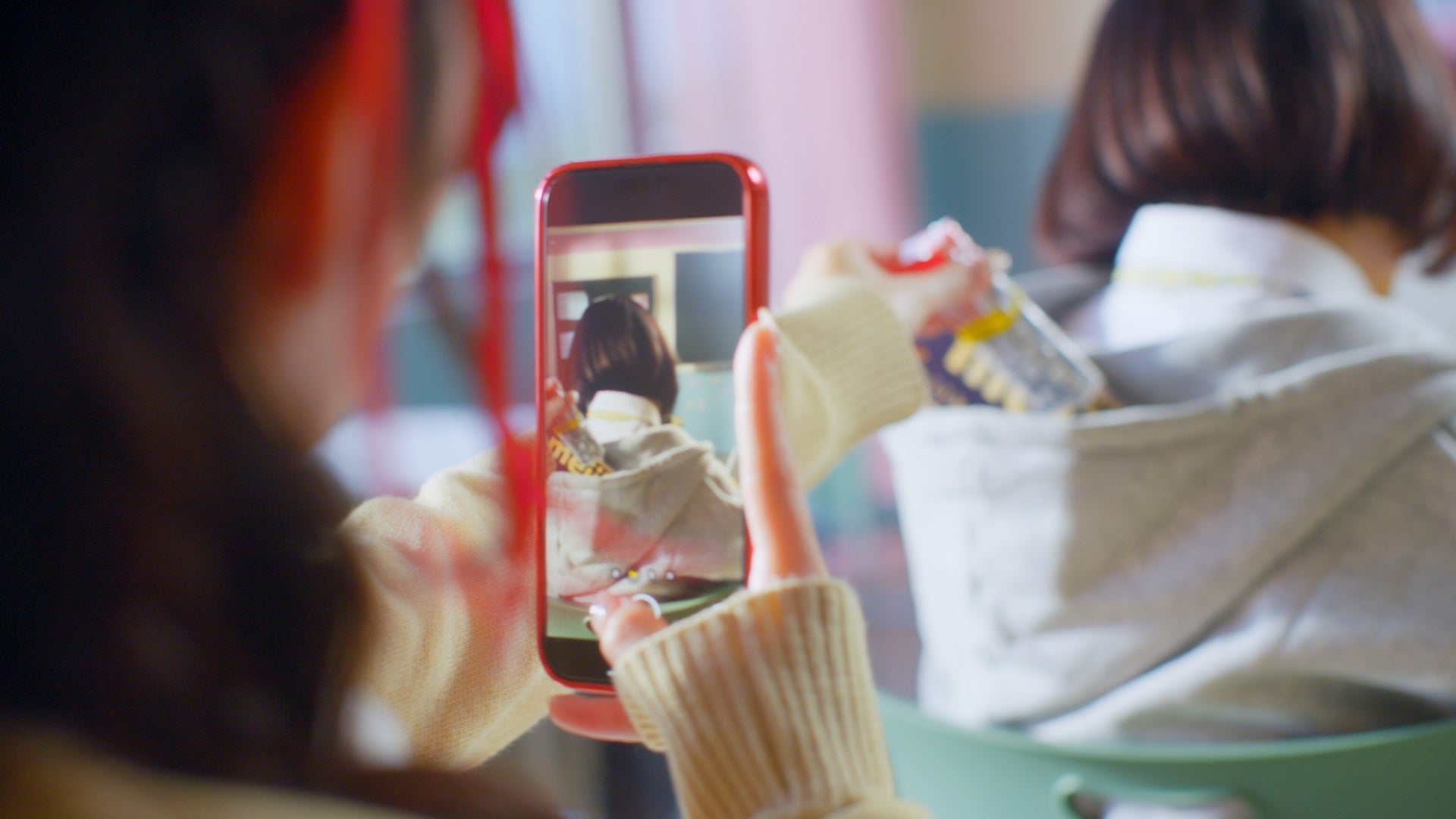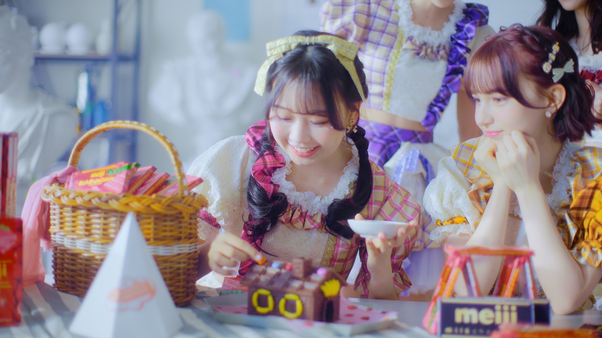 季節はバレンタイン、色とりどりの制服を着たメンバーがお菓子の入った袋を持って学校に集合。お菓子を取り出しながら、明治のチョコレートを使った様々なあそびを始めます。アイドル衣装を着て歌って踊る自分達の動画をスマホで見ながら、デコレーションされた『推しチョコうちわ』を振って応援していると、スマホの中の映像に切り替わります。