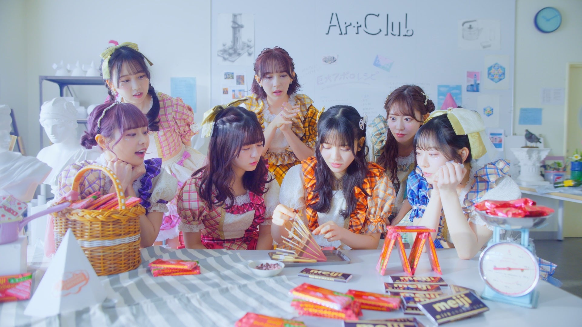 メンバーが制服姿で学校に集まり、#推しチョコバレンタインの“あそび方”である「わがままスイーツタワー&ミラーケーキ」「巨大アポロ」「推しチョコうちわ」「ヒロインロッカーサプライズ」「バレるまで愛伝える選手権」「おかしブーケ」を自由に楽しむ様子を描いています。