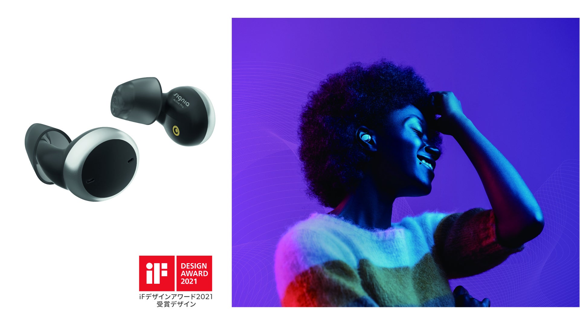 多くの年代の方がワイヤレスイヤフォンを利用している昨今、「耳に何かを入れている」状態は当たり前になりました。Signia Activeは、ワイヤレスイヤフォンのような形と高級感あふれるカラーで、補聴器を隠すものから見せるものへ、そして魅せるものへと変化させました。そのデザインは世界3大デザイン賞といわれるiFデザインアワードを受賞、世界中で愛されています。
