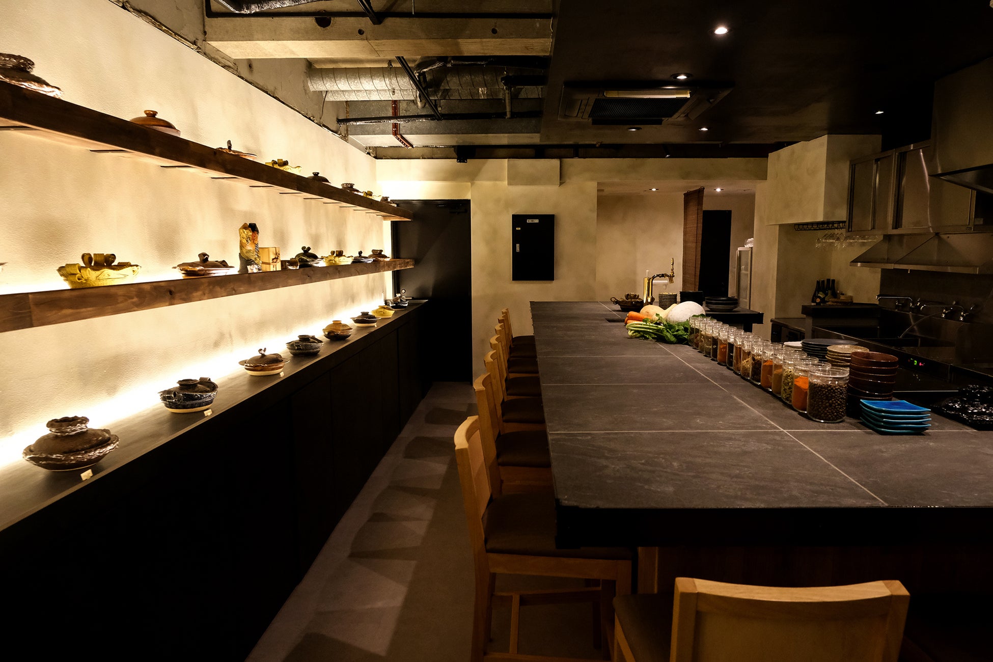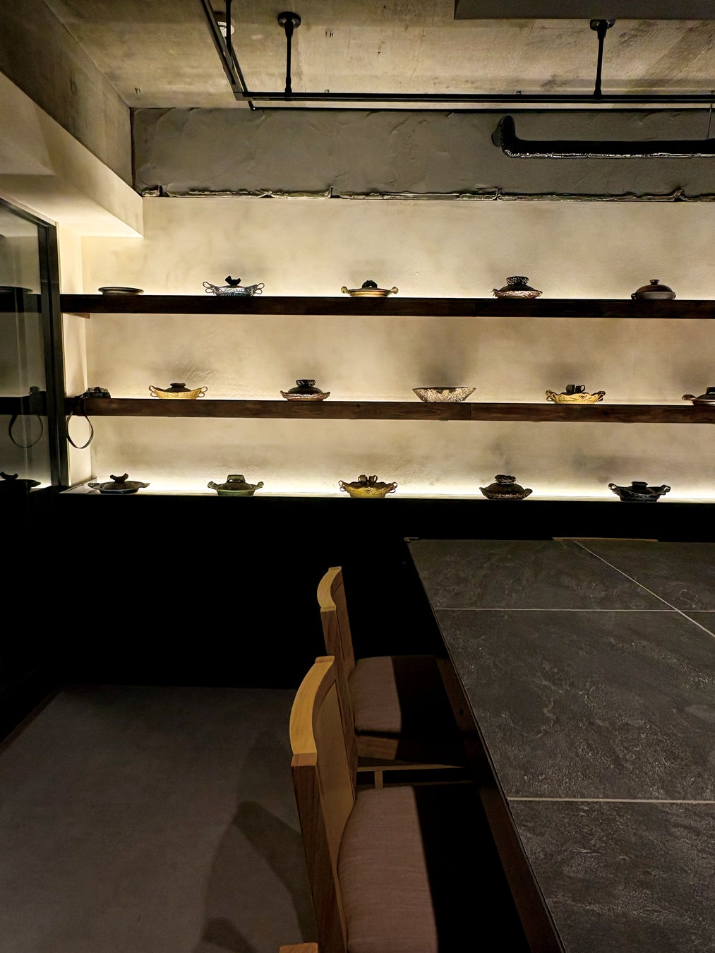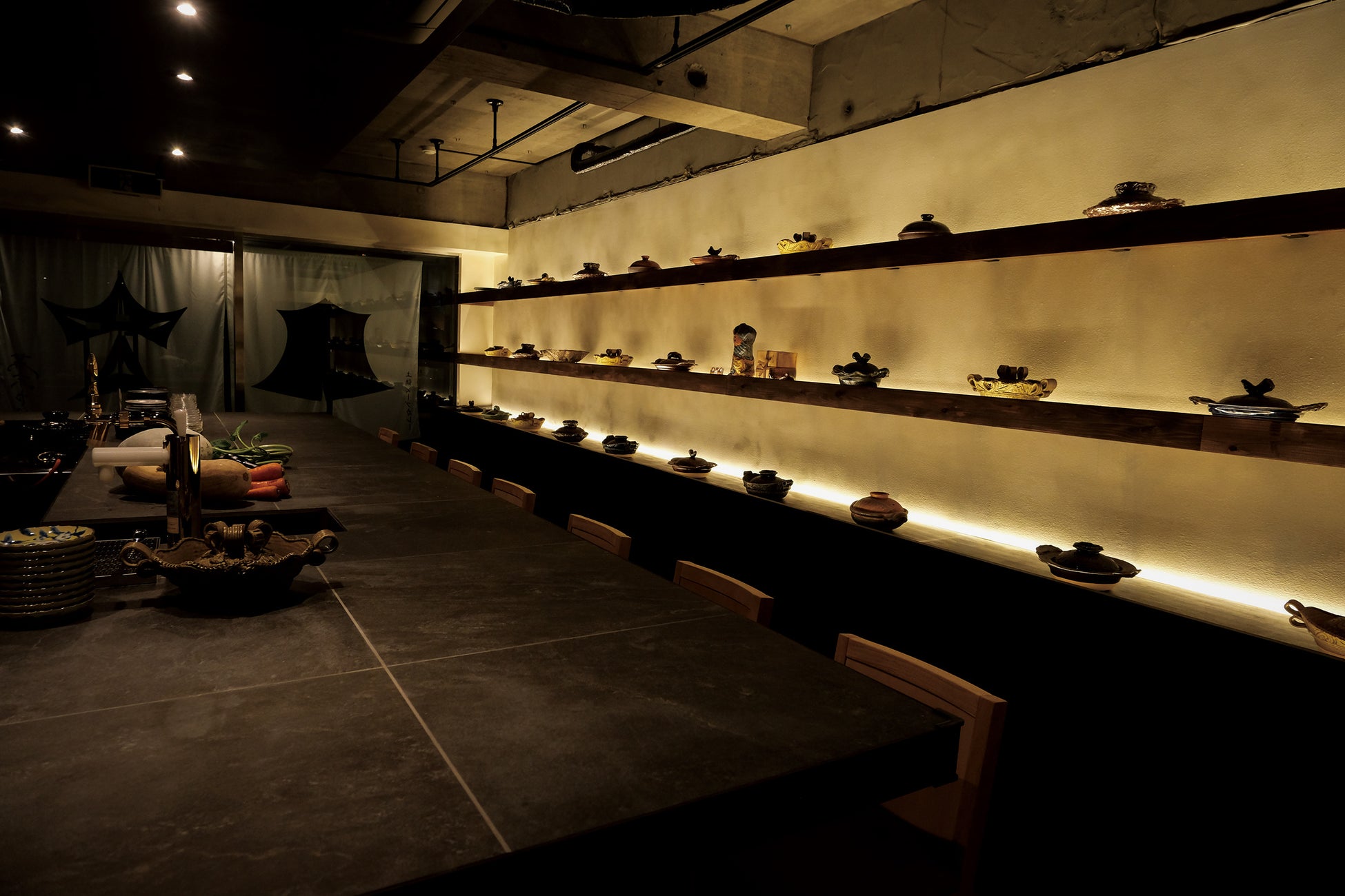 カウンター席の後ろにはギャラリーが設けられており、こちらに並ぶオリジナルの土鍋や陶器などは、店頭でご購入いただくことも可能です。