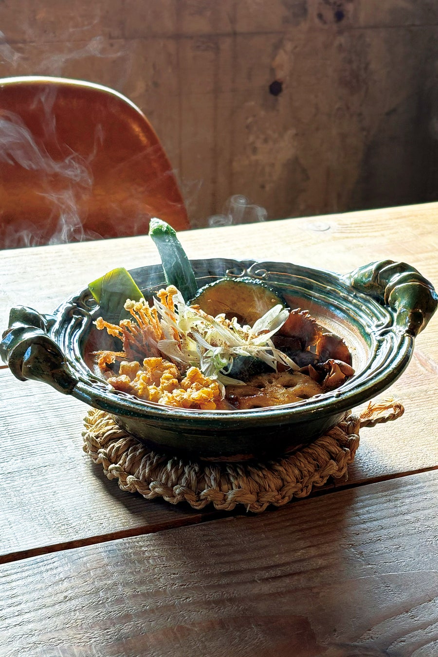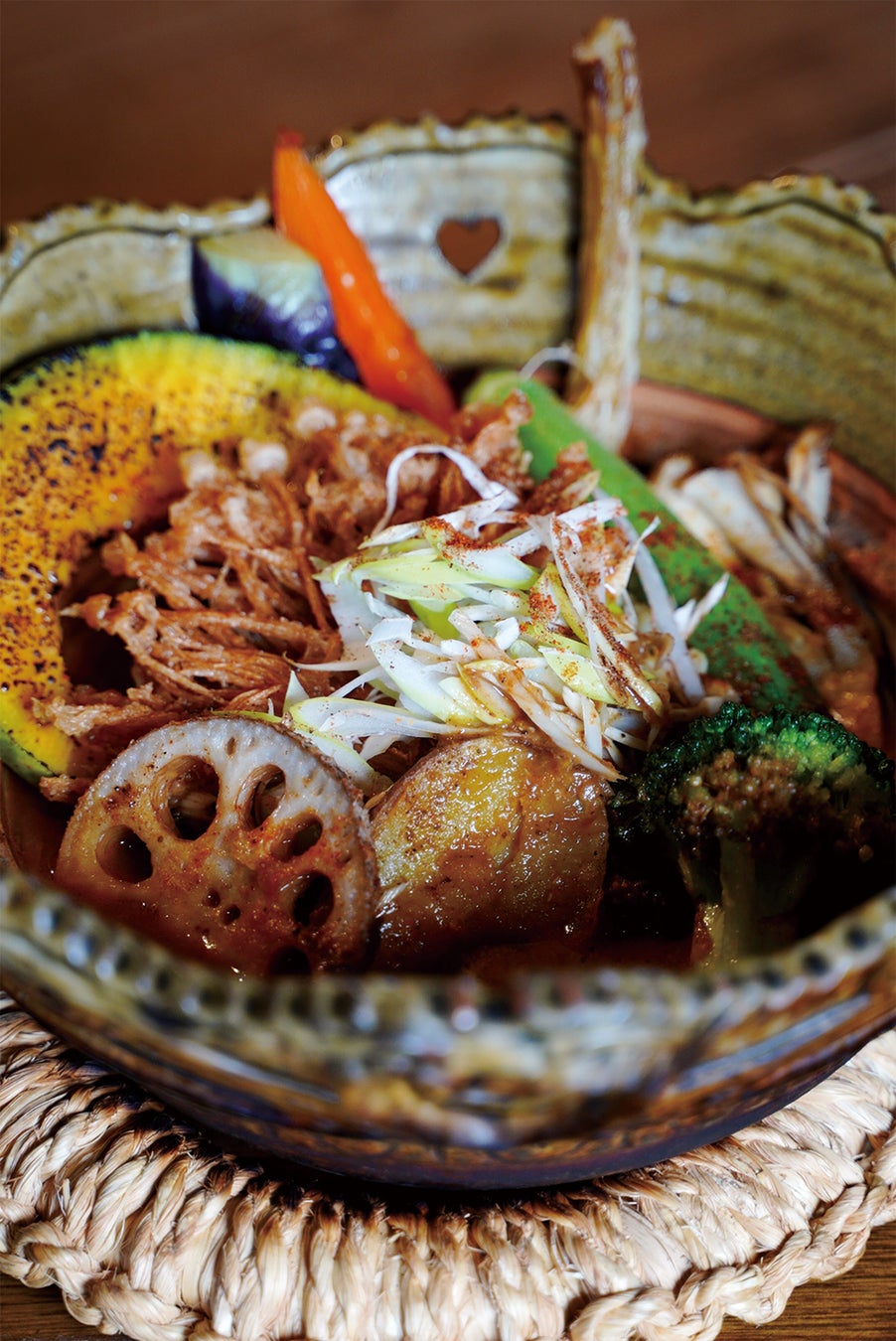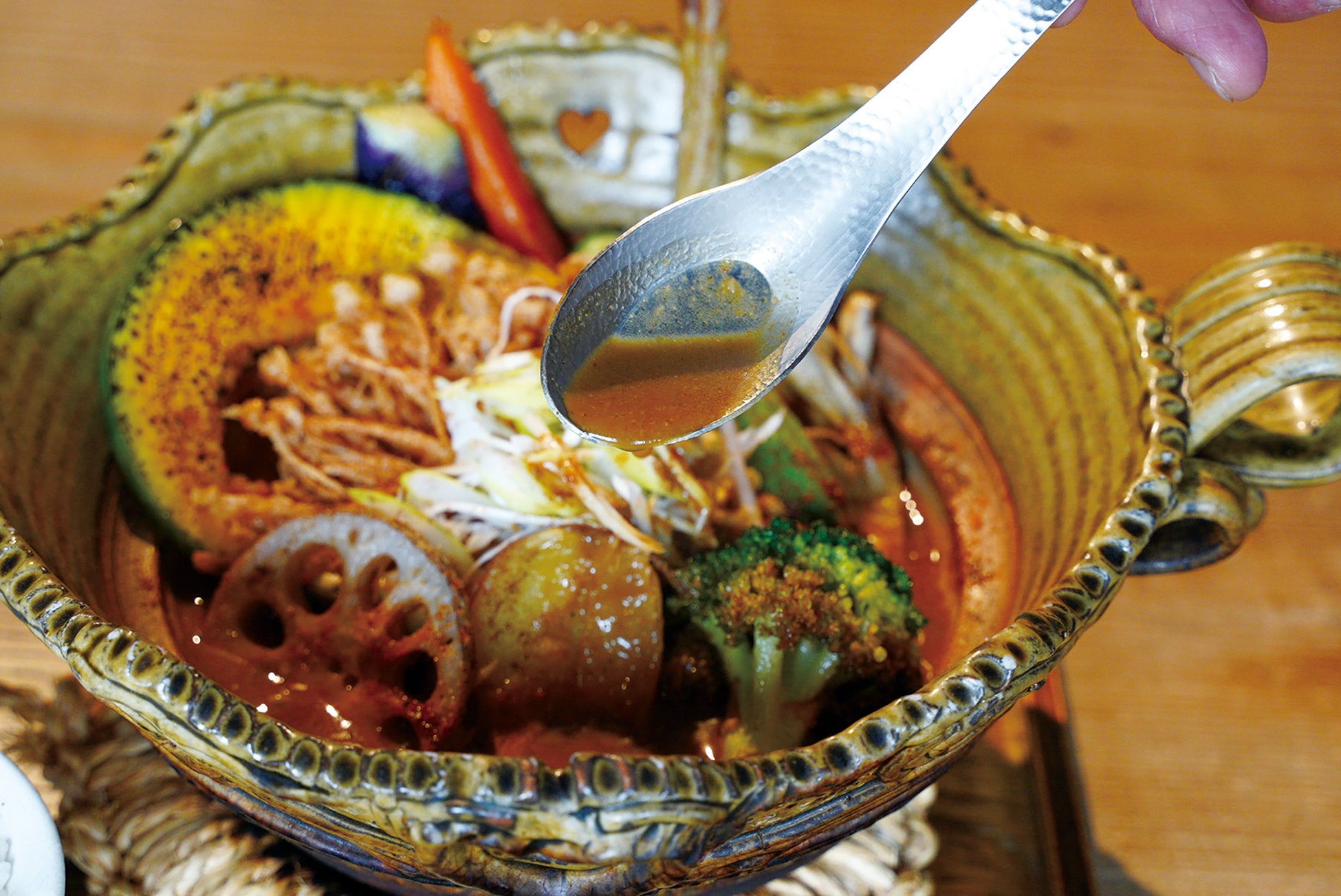 スープカレー 自分たちの手で育てるこだわりのオーガニック野菜を惜しみなく使用した出汁をベースに、和の旨味とスパイスを調和させたオリジナルの特製スープです。 職人の手でひとつひとつ作られた特注の土鍋で仕上げ、提供することで、更に香りと旨味が引き立ち、最後まで熱々のスープを味わうことができます。