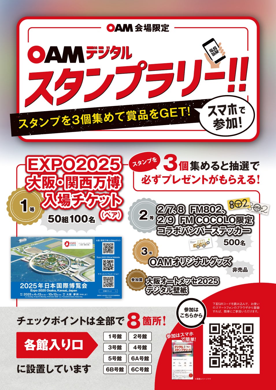 OAM の会場限定で、スタンプを3個集めると抽選で必ずプレゼントがもらえるスタンプラリーを開催します。チェックポイントは全部で8か所あり、各館の入り口に設置されています。