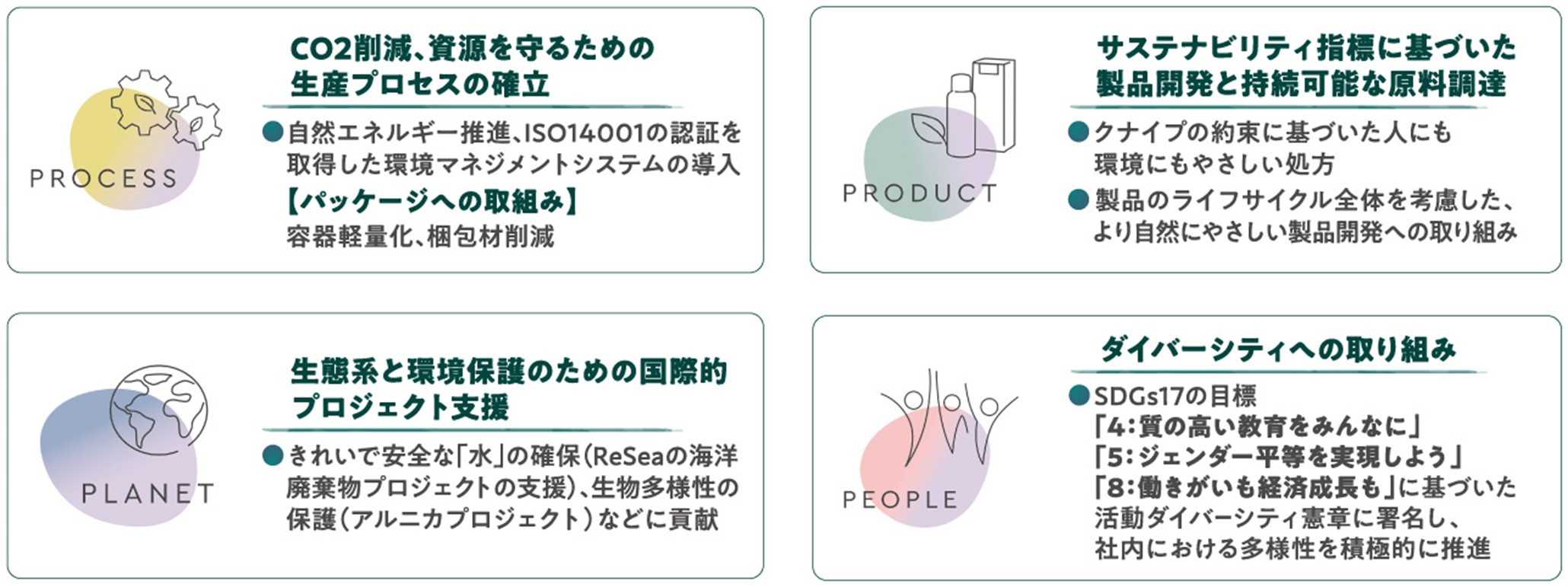 クナイプは、原材料の購入から生産、包装、ロジスティクスに至るまで、サステナビリティに関する具体的な目標を立て、取り組んできました。クナイプの全ての製品が、厳しいサステナビリティ指標に基づき開発されています。
