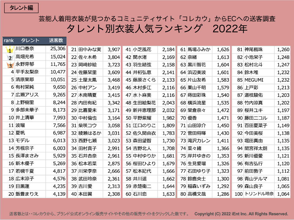 OMO(Online Marge with Offline)ソリューションを手掛けるアイエント株式会社(本社:東京都渋谷区神宮前、代表取締役 大森智人)は、ファッションに特化したEC支援やPRプラットフォームを開発・運営しており、自社サービス「芸能人が着用した衣装が見つかるコミュニティサイト(コレカウ)」を運営する際に取得するファッションデータを活用し、2022年にテレビ放送された番組や出演したタレントのファッション、ブランドの人気ランキングを発表しました。