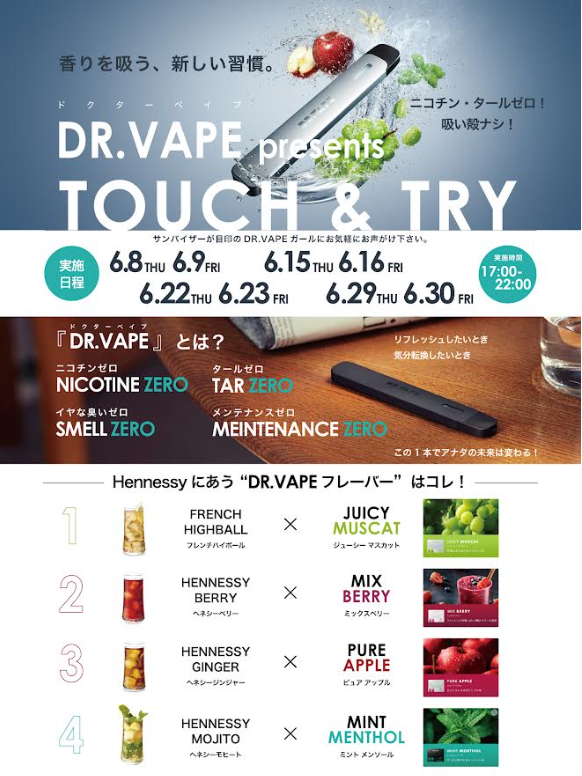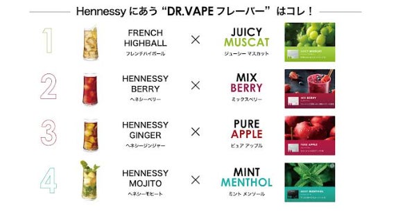 さらにDR.VAPEのフレーバーとのペアリングとして相性抜群のヘネシーを使ったオリジナルカクテルもお楽しみいただけます。