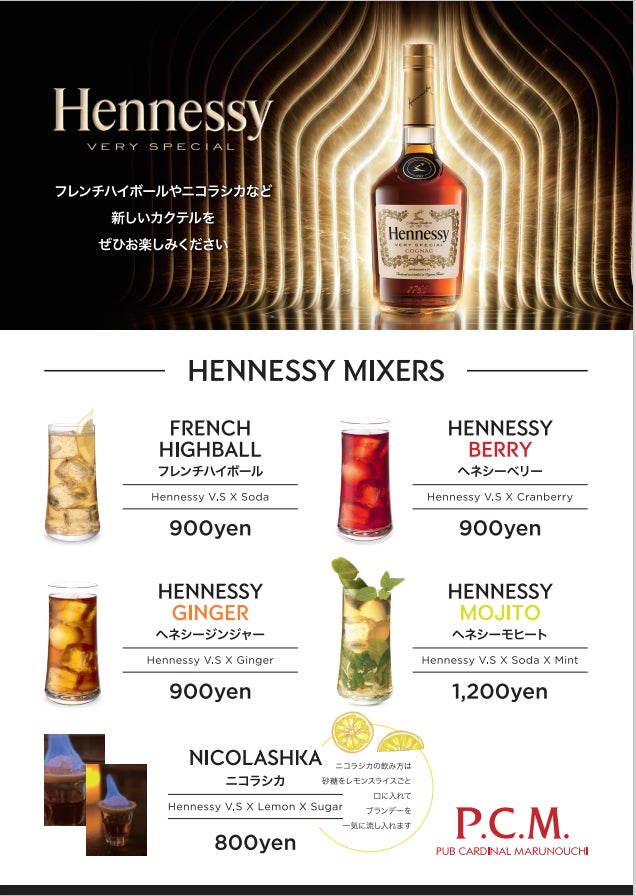 すべてに、コニャックの世界的ブランドHennessy(ヘネシー)を使用し、バラエティ豊かなドリンクをご用意しています。