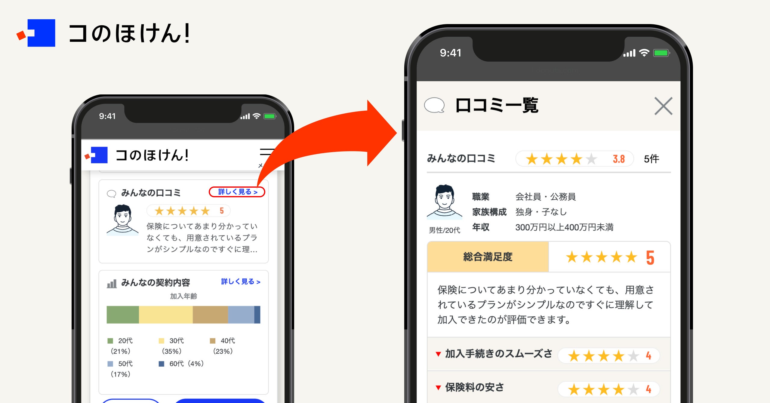 お客さまの声にお応えし、新機能を追加!!保険商品ラインキングページにおいてお客さまの口コミを掲載開始。保険の診断・一括比較・見積もりサイト「コのほけん!」