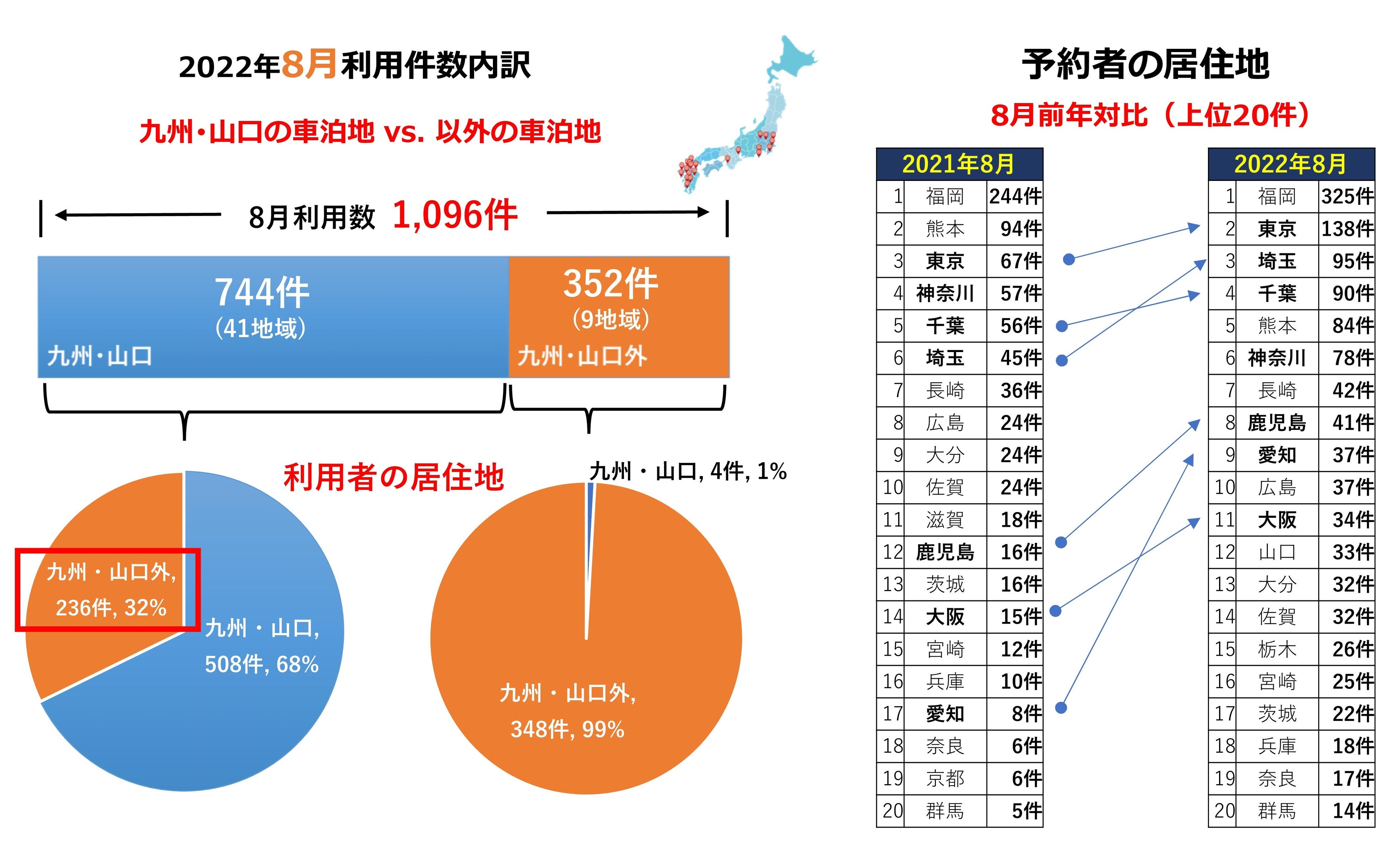 2022年8月の車泊利用件数=1,096件の内訳は、九州・山口の車泊地が744件、本州(山口県を除く)の車泊地が352件。利用された方の居住地(下図左)をみると、九州・山口(41地域)で車泊をされた方の32%は本州から来られていました。今年はコロナによる行動制限がなく、夏休みの帰省を兼ね滞在選択肢の一つとして、車泊を選ばれました。8月全体の車泊利用者(下図右)は、人口の多い関東在住者の利用が増えています。