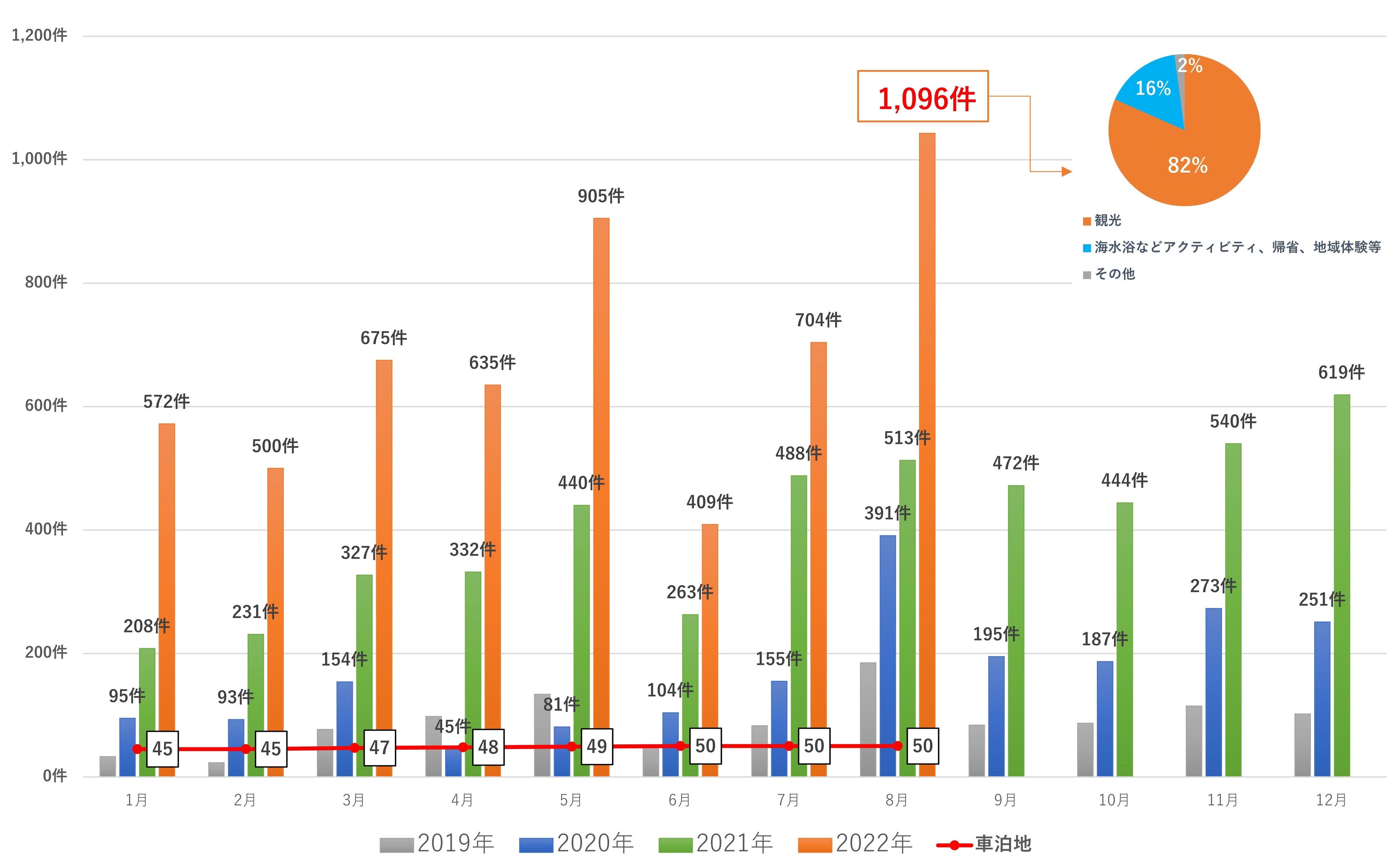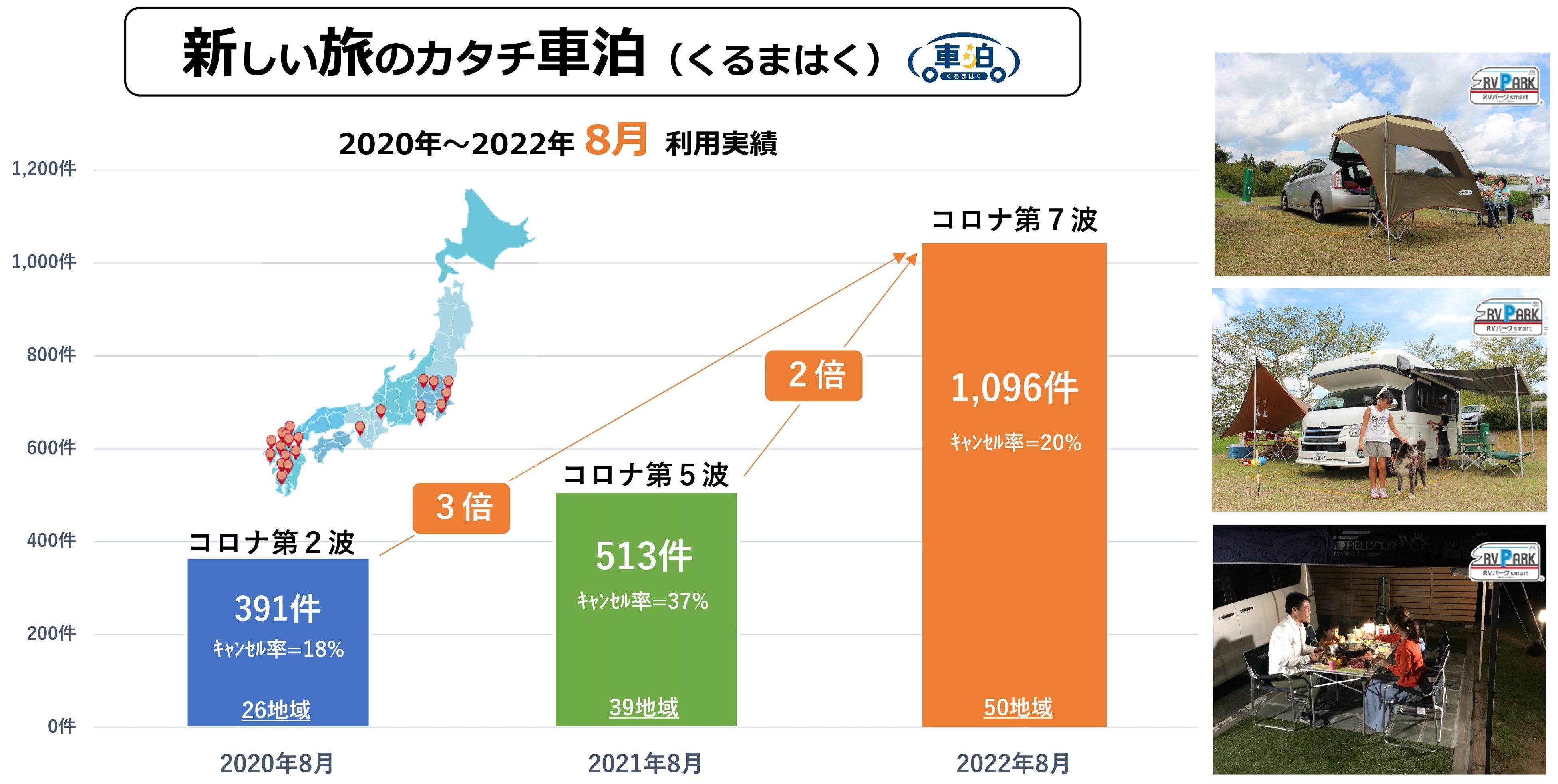 九州周遊観光活性化コンソーシアム(代表機関:トラストパーク株式会社 本社:福岡県福岡市博多区、代表取締役:山川 修)が各地の観光振興を目的として広域展開中の「車泊」。密を避けた移動と滞在ができる「キャンピングカー」の利用増加とともに、コロナ禍初の行動制限がない夏休みを迎え、8月の車泊利用件数は過去最高を記録、前年比2倍増・前々年比3倍増で推移しております。