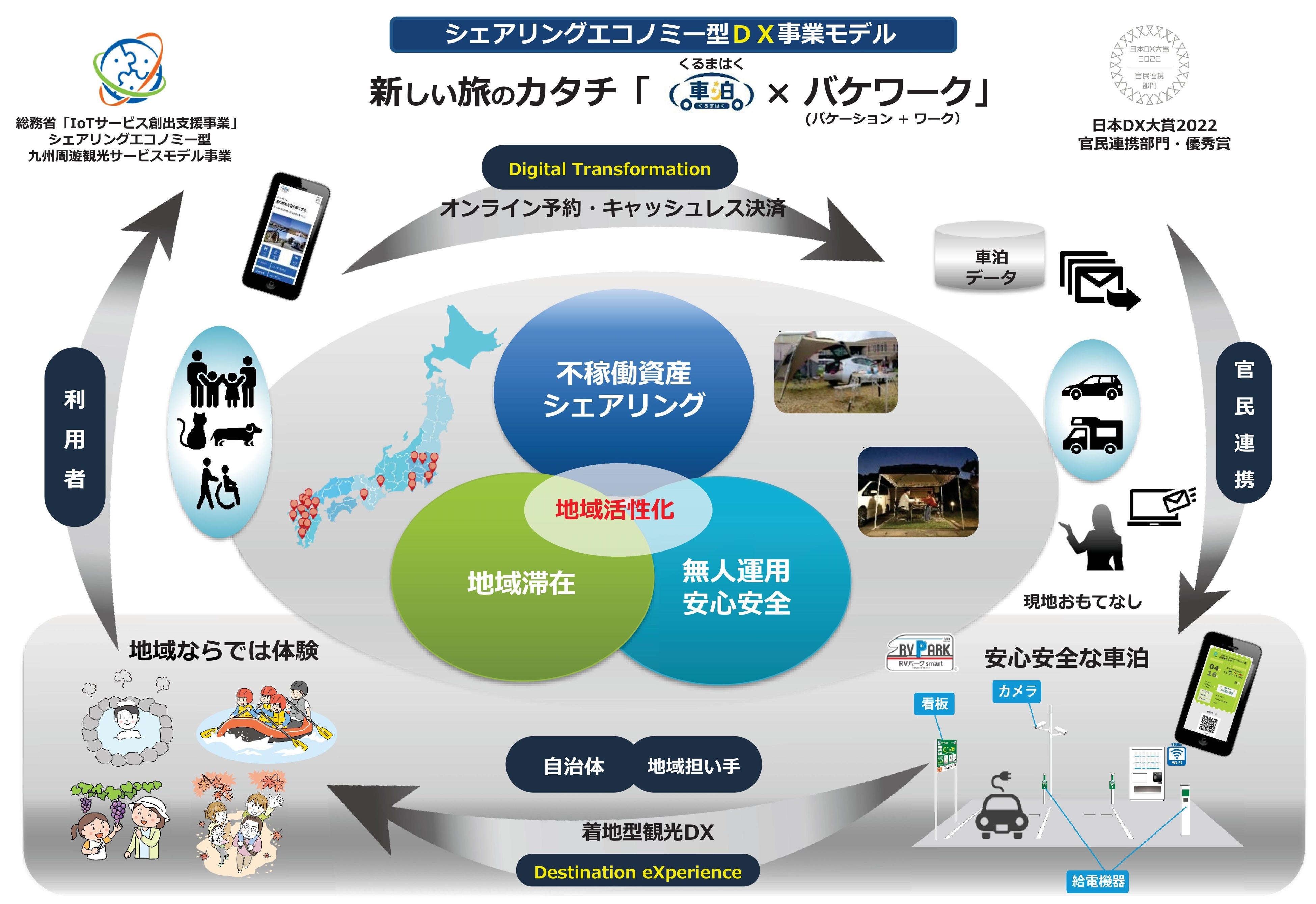 ※2022年6月開催 日本DX大賞決勝大会(官民連携部門)において『シェアリングエコノミー型DXコンテンツで地方創生!新しい旅のカタチ 車泊× バケワーク』と題して発表し優秀賞を受賞しました(URL https://dx-awards.jp/)。