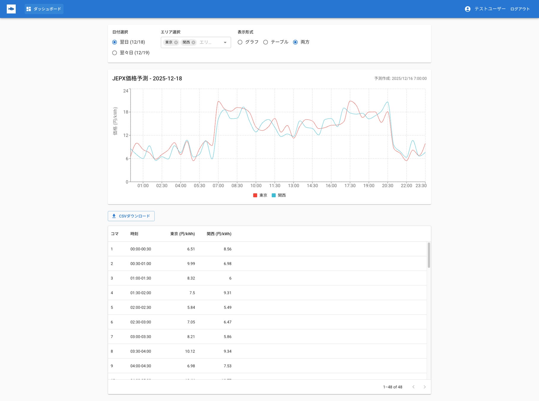 これまでAPI経由で取得していた予測データを、グラフや表形式で視覚的に表示。専門的な開発スキルがなくても、翌日の価格予測推移を一目で把握でき、日々の運用判断に即座に活用いただけます。