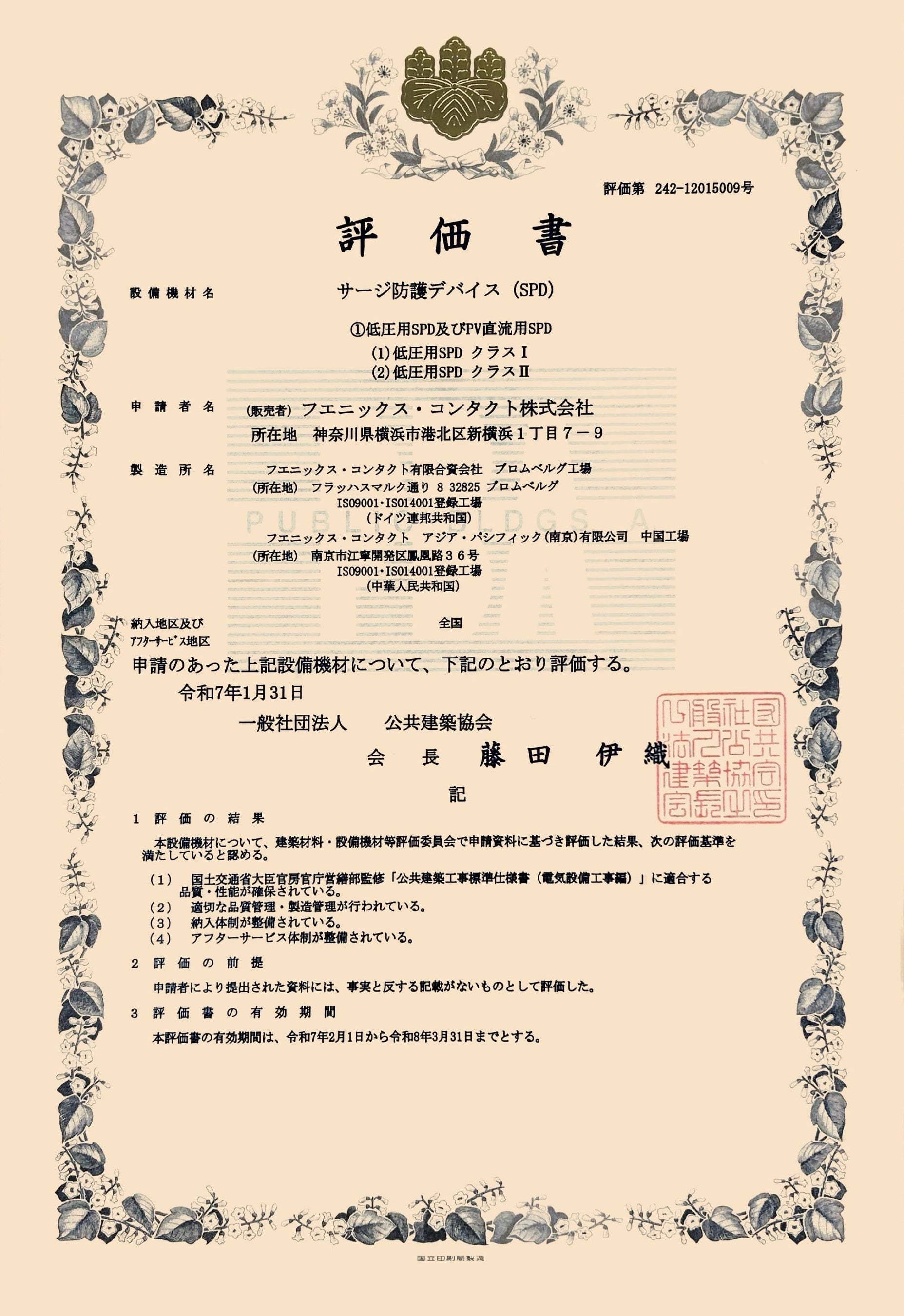 フエニックス・コンタクト株式会社(本社:神奈川県横浜市、代表取締役社長:吉野 博通)は、2025年2月1日(土)付で、低圧用サージ保護機器(電源用SPD)の全5シリーズにおいて、一般社団法人 公共建築協会の建築材料・設備等品質性能評価を受け評価書を取得しました。本評価書は、公共建築の営繕工事において使用される材料等が、国土交通省の公共建築工事標準仕様書に適合することを証明し、その工事受注者と発注者間の多大な労力を軽減する目的で発行されています。