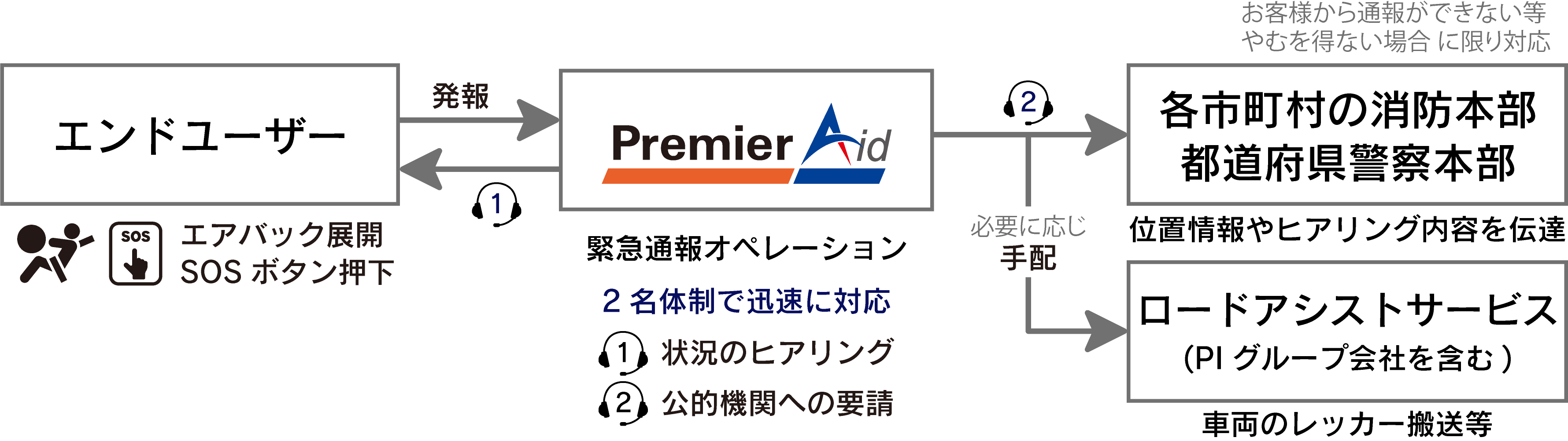 会社情報 :事故や急病による体調不良等が発生した時、車両や建物、モバイルデバイス等から発信された位置情報、デバイス情報、事故映像等のデータに基づき、エンドユーザーの状況を即座に察知し救急要請及び通報する「緊急通報オペレーション」を提供しています。市町村ごとに設置されている全国の消防本部とのネットワークを有し、最寄りの公的機関への迅速な連携を実現しています。